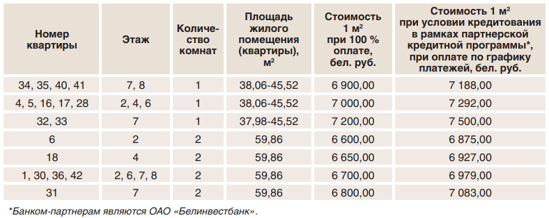 — 11 однокомнатных общей площадью 38−45 квадратов по стоимости 6900−7200 рублей (2415−2520 долларов) за метр;