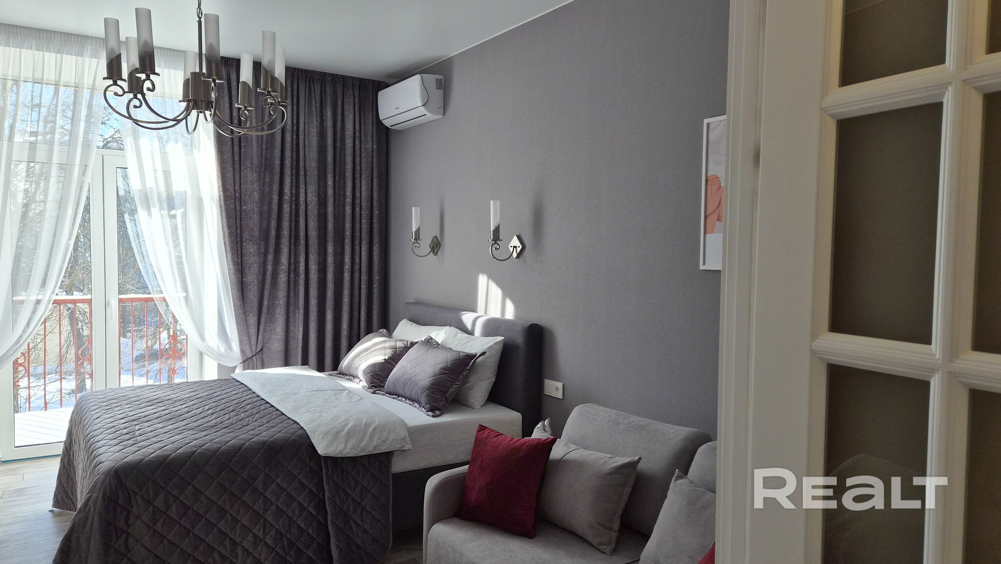Обе комнаты обустроены как спальни, где стоят полноценные кровати. Одна из них с выходом на открытый балкон и небольшой зоной отдыха. Тут есть кондиционер.