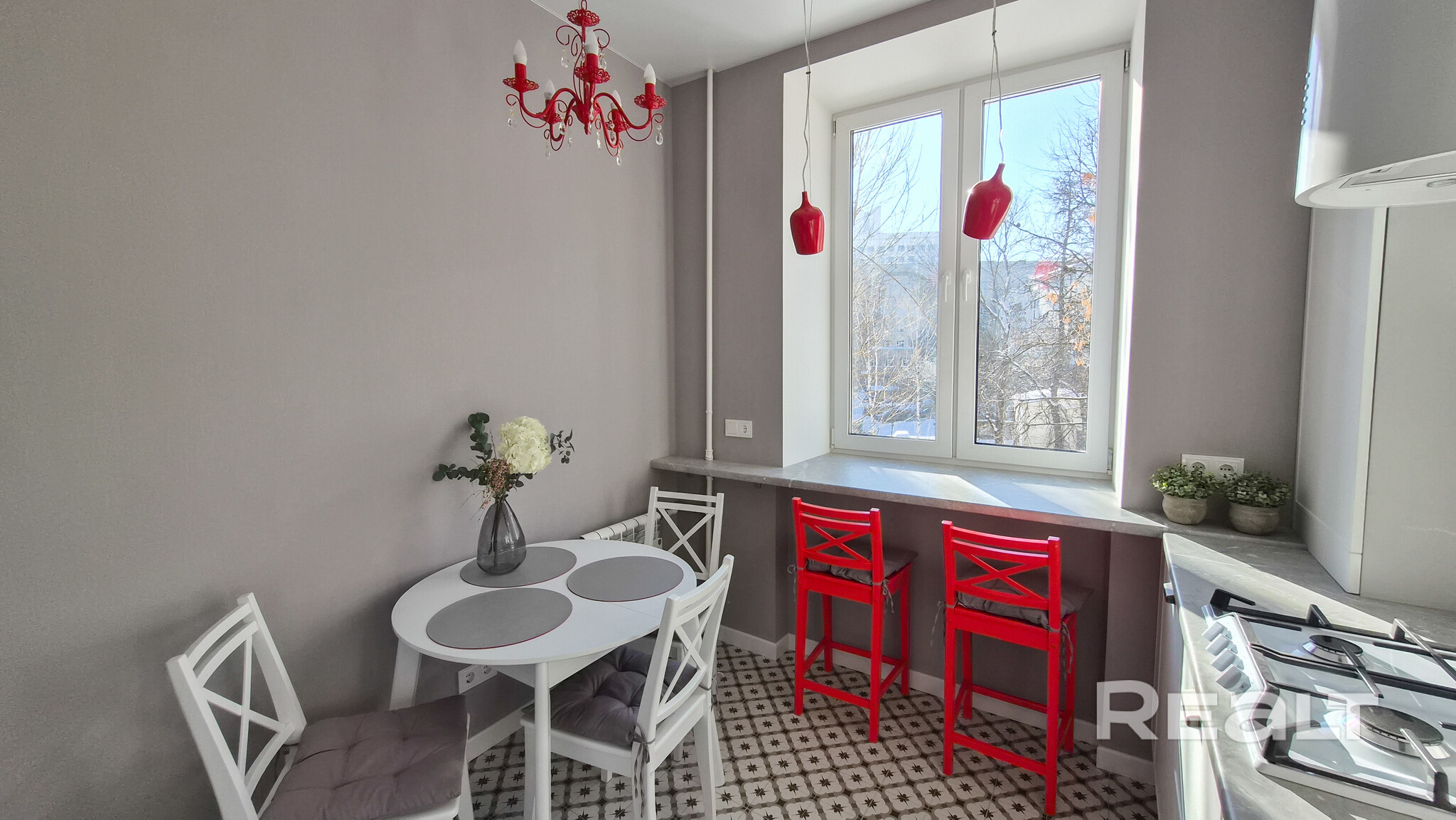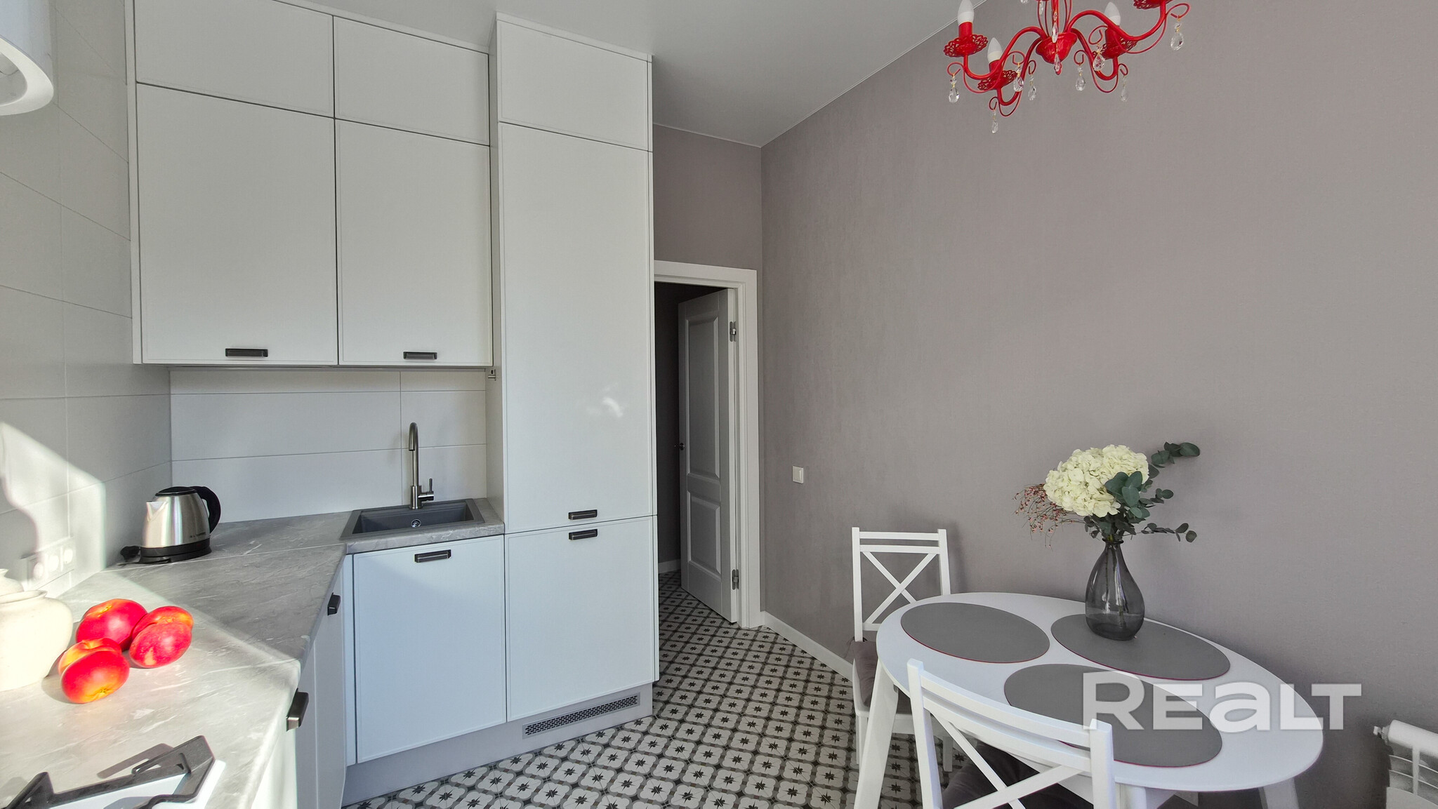 В двушке сделан хороший ремонт, который позволяет заселиться сразу после покупки. Кухня обставлена г-образным гарнитуром и бытовой техникой, включая встроенный холодильник и газовую поверхность. Здесь же владельцы сделали две обеденные зоны: одну расположили у окна, вторая представлена в виде круглого столика и нескольких стульев.