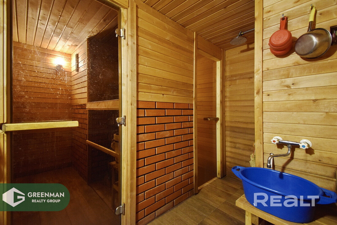 На огороженной территории в 6,35 сотки нашлось место для гостевого домика, бани, беседки и открытого бассейна. Отопление во втором доме —печное, но есть и электрорадиаторы.