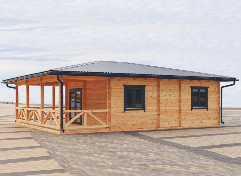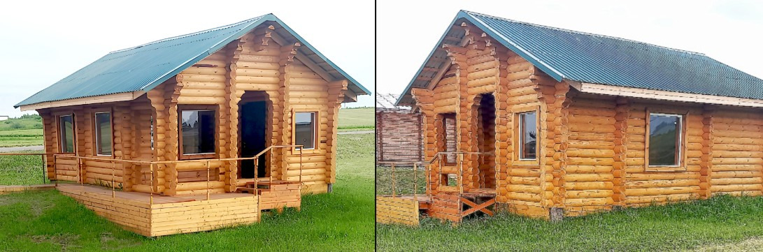 Более приспособленным для дачной жизни выглядит деревянный домик из кругляка размером 5,6×7,6 метров. Планировка такая: терраса-крыльцо, тамбур, гостиная-кухня, спальня и санузел. Сруб со стропильной системой стоит 19 тысяч рублей.