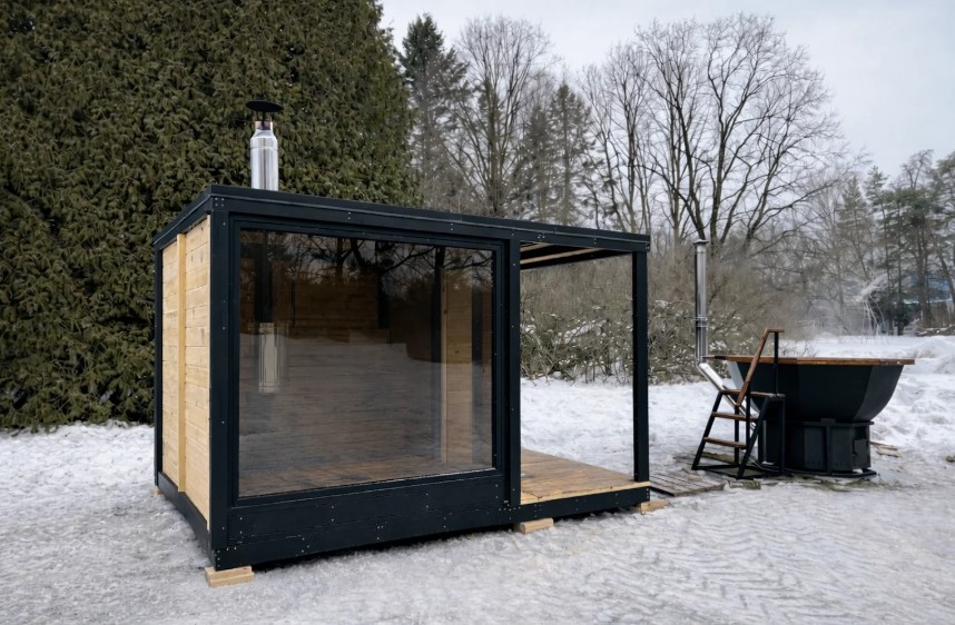 Компания «Севиол Технолоджис» предлагает оригинальные бани с панорамным остеклением. Самые бюджетные представляют собой кабины с парилкой и навесом над местом для купели — от 10 900 рублей. В том же стиле, но уже больше по площади и с комнатой отдыха или моечной стоят от 17 500 рублей.
