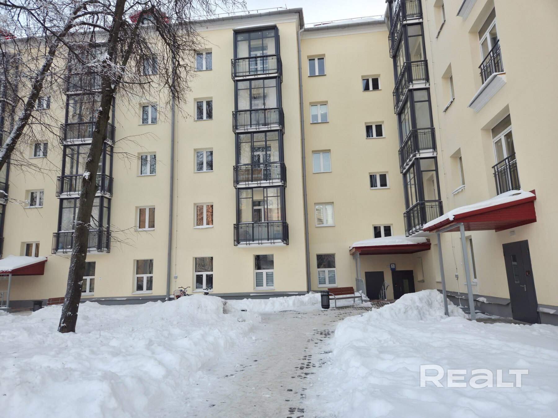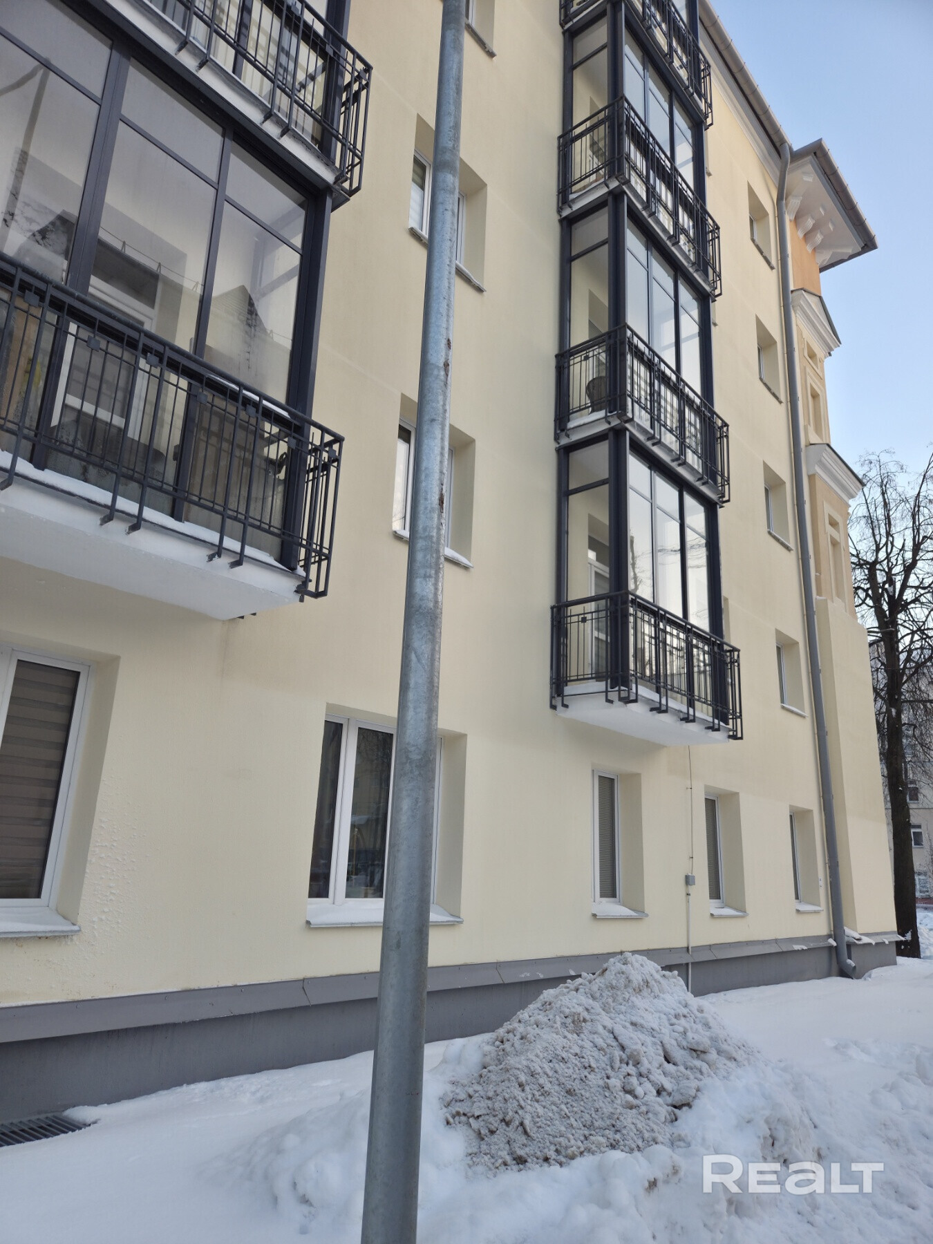 Глобальная реконструкция жилого дома завершилась только в 2025 году. Бывшее общежитие получило треугольный фронтон на крыше и новые балконы. Лифтов в пятиэтажном доме на три подъезда не предусмотрели, но зато тут сохранили высокие потолки и толстые стены.