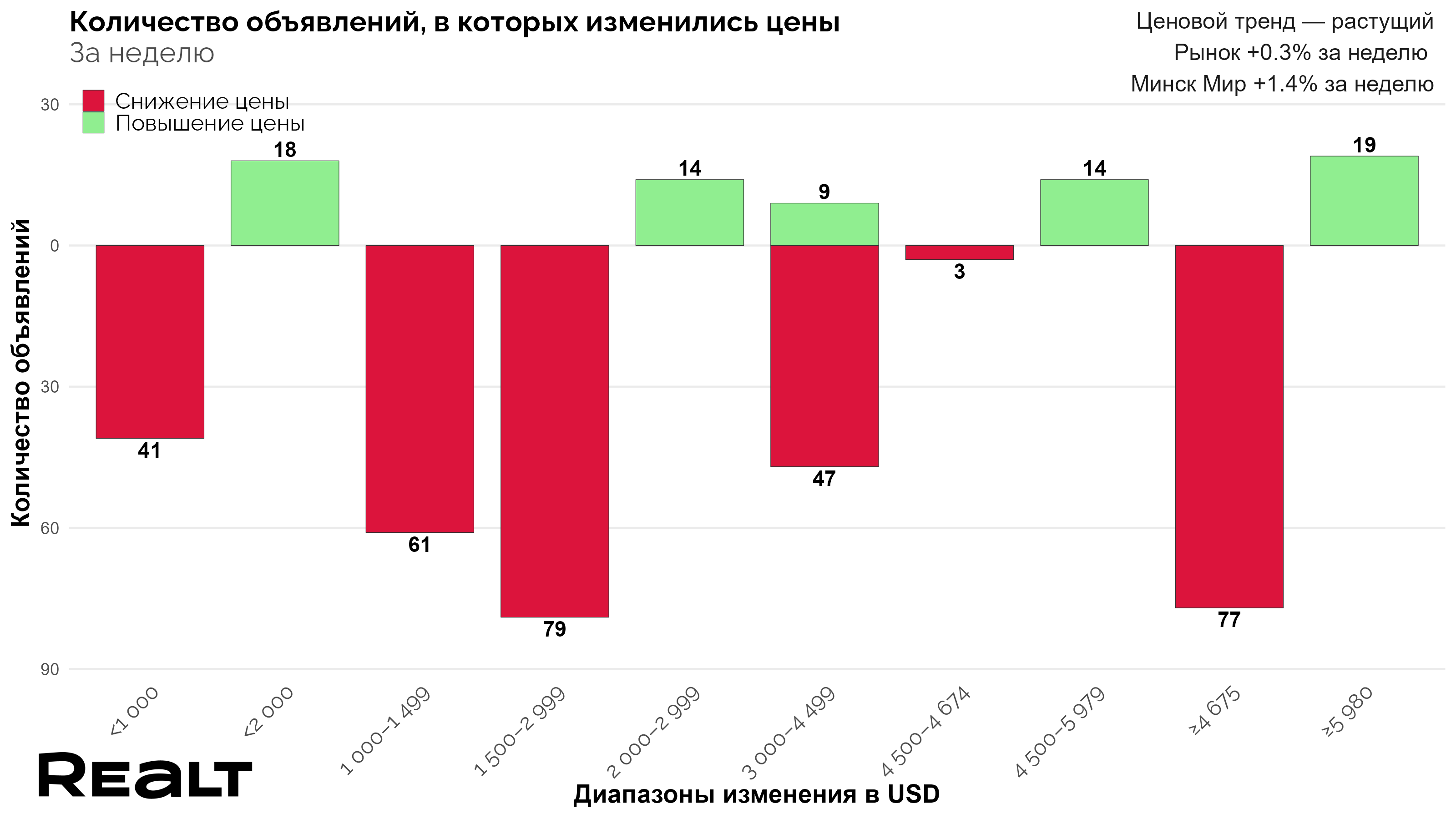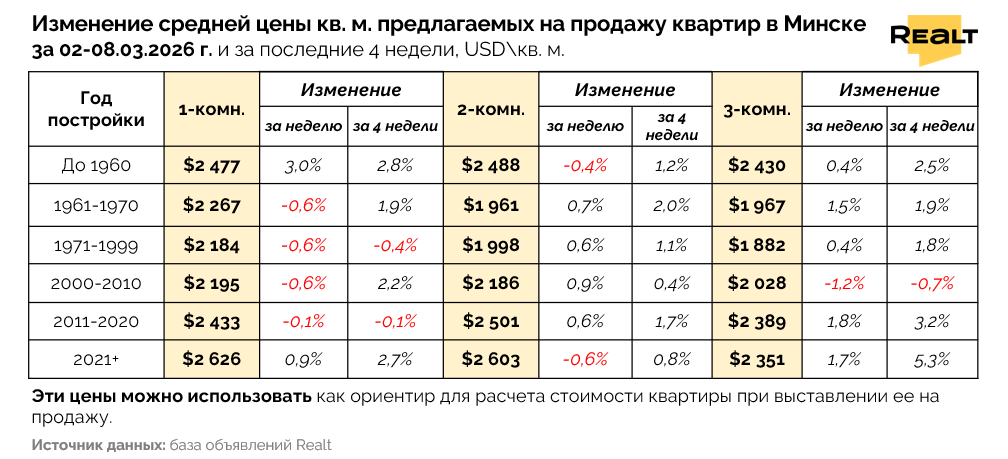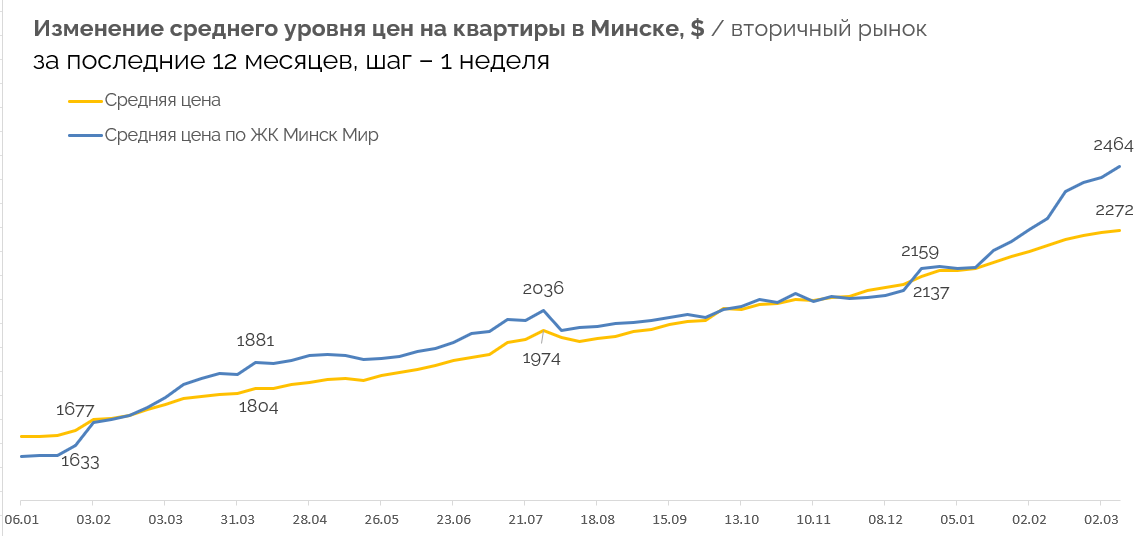 В результате средняя цена квадрата в объявлениях по всему Минску, за прошедшую неделю подросла в рамках погрешности на +0.3% до уровня 2272 $/м2. А в Минск-Мире прирост составил уже 1.4% до 2464 $/м2.