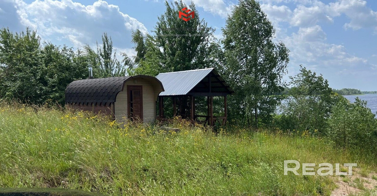 На берегу имеются баня и беседка. Рядом с домом — металлический гараж.
