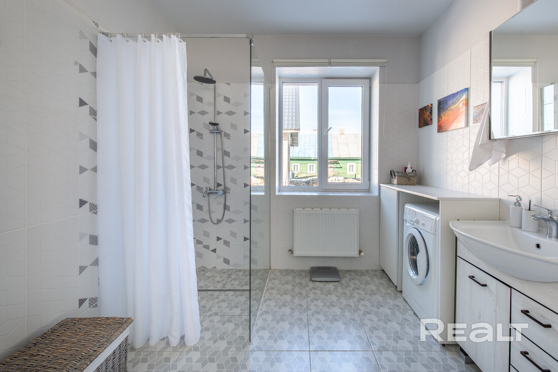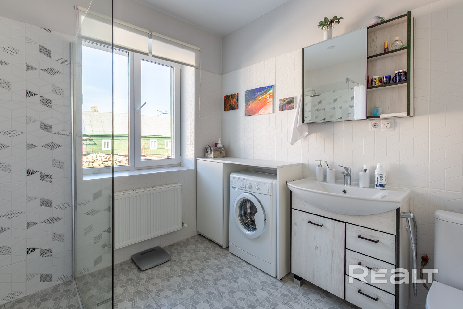Реконструкция добавила дому комфорта. Под санузел с душевой выделили комнату с окном, на пол положили крупноформатный керамогранит.