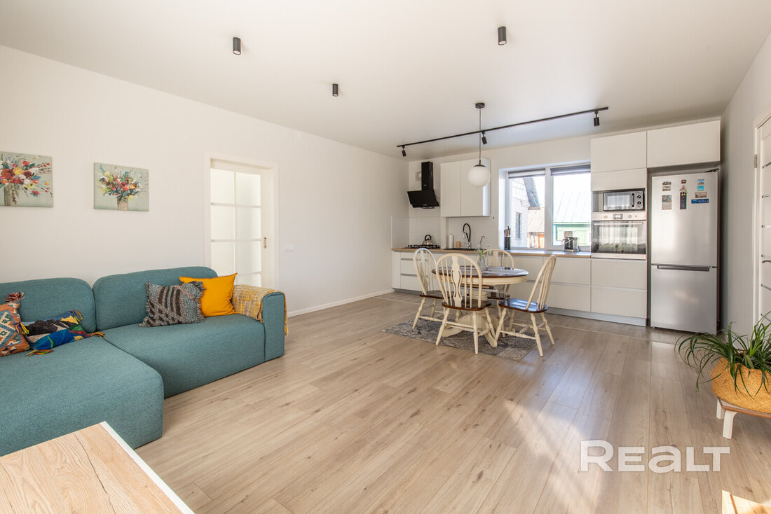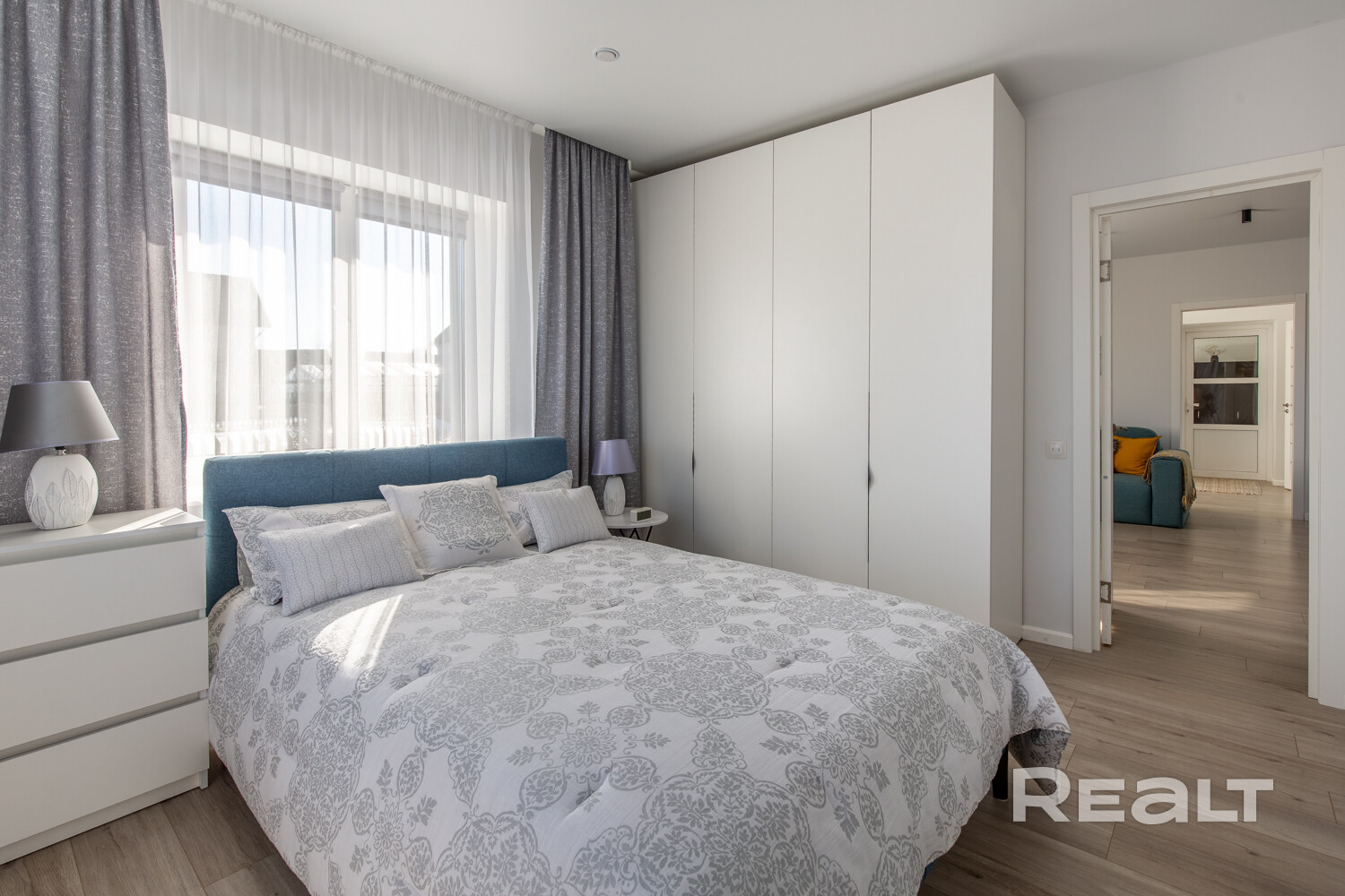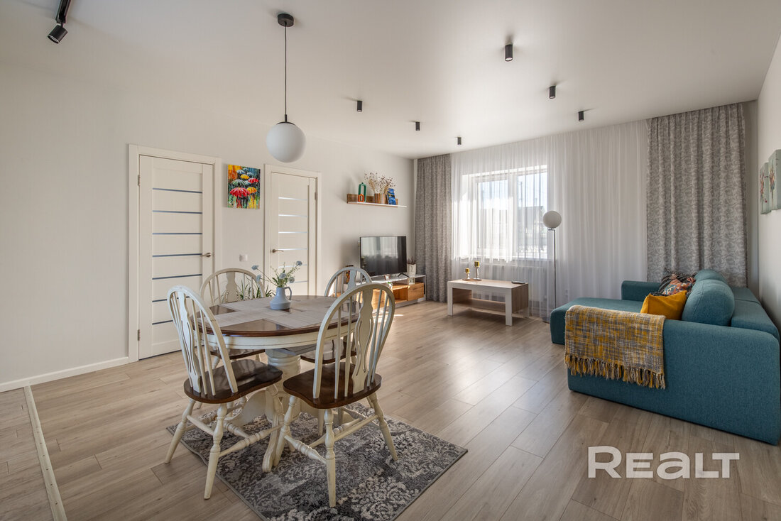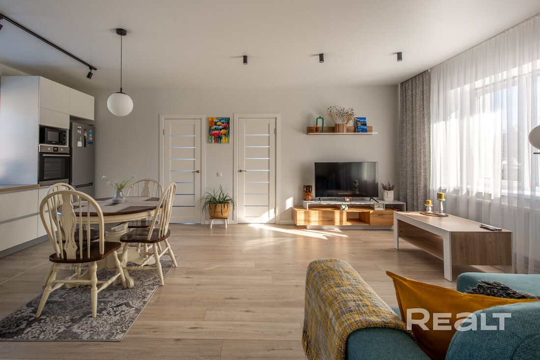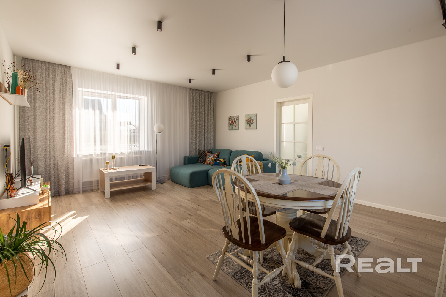 Общая площадь — 90,3 м². Планировка удобная: светлая прихожая, большой санузел, кухня-гостиная с добротной мебелью и бытовой техникой, две спальни. Отметим высокие потолки во всех помещениях.