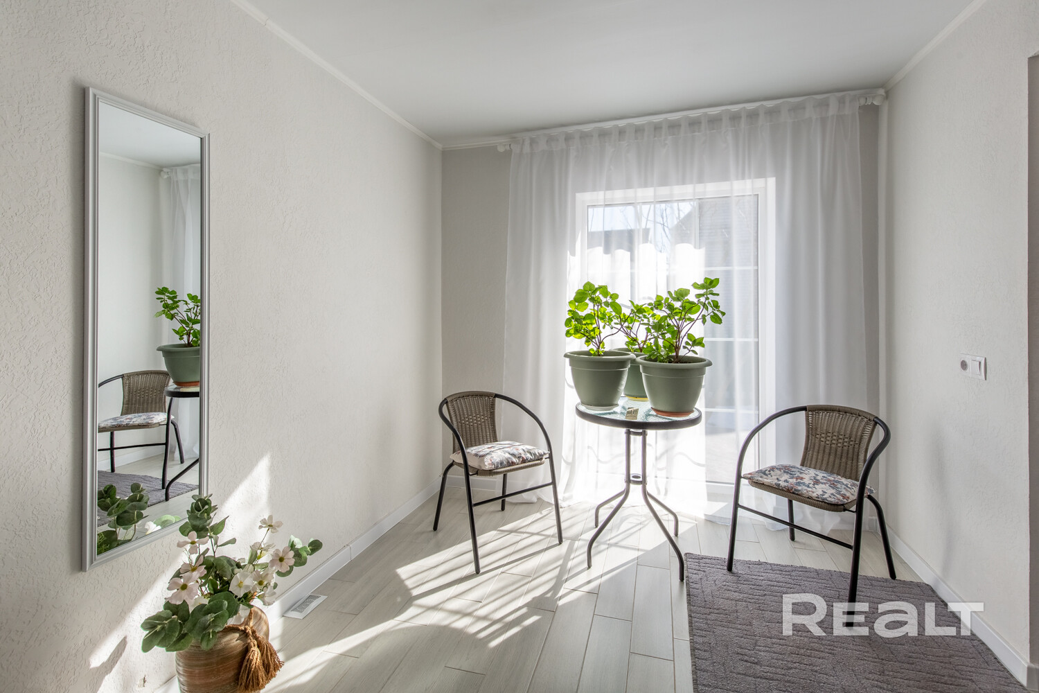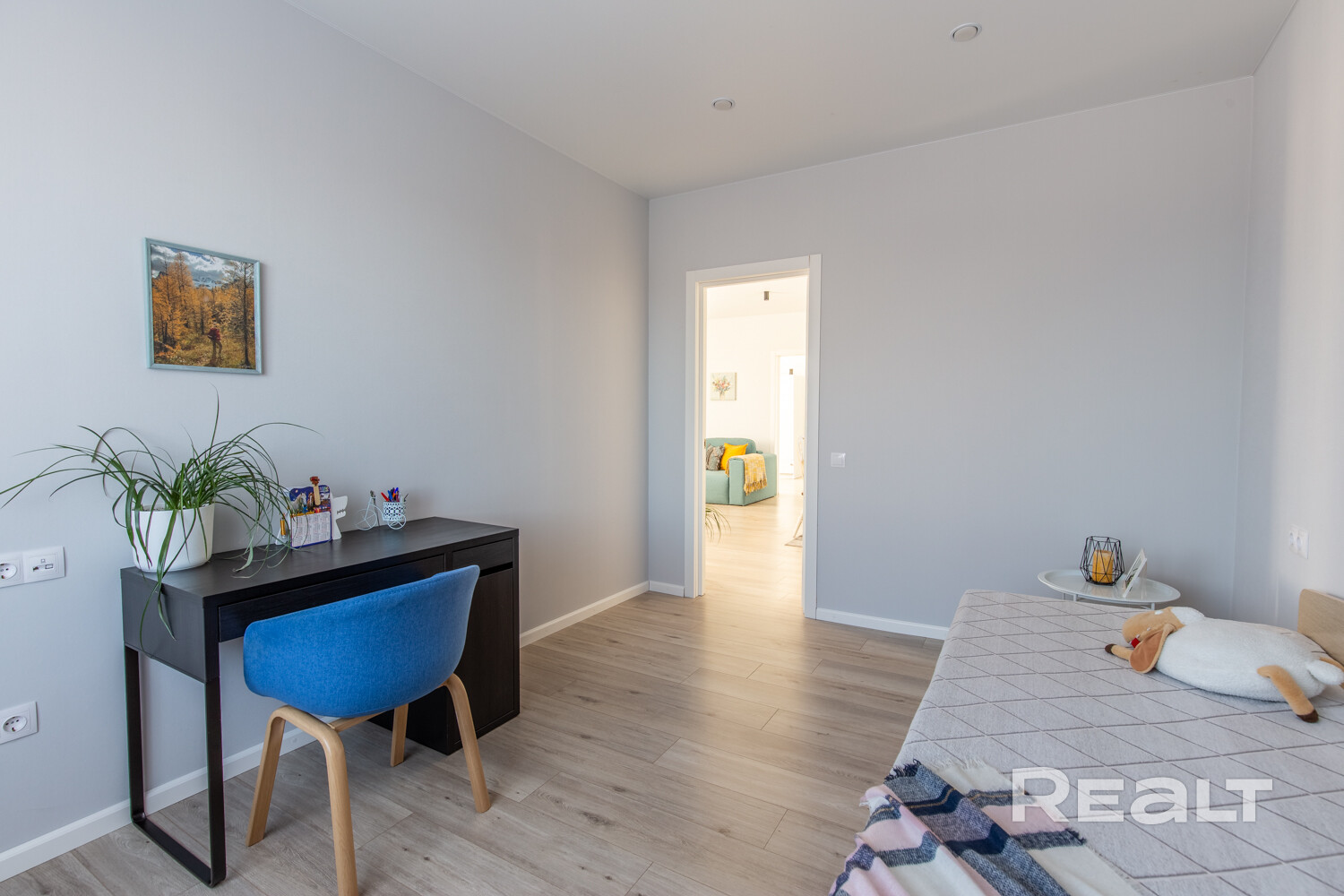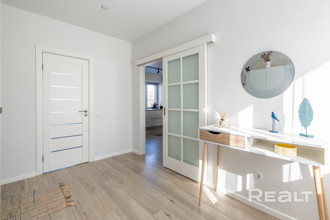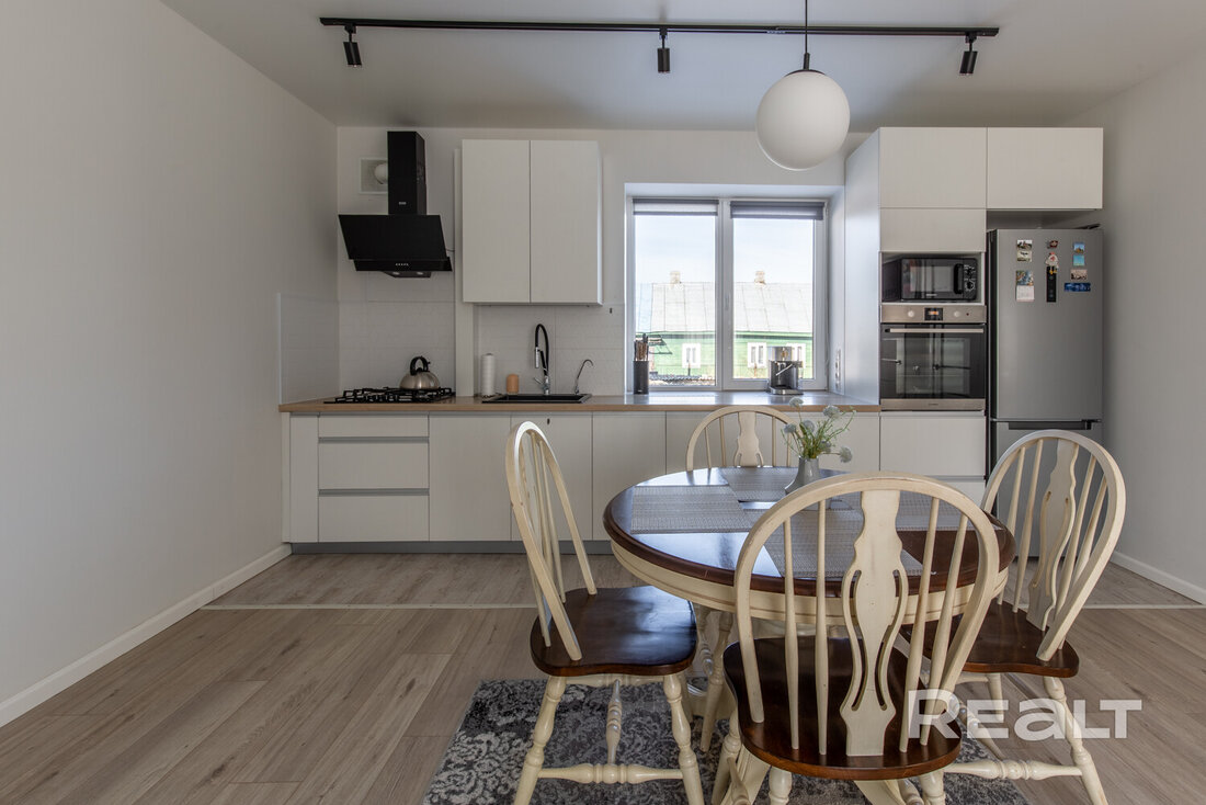 Общая площадь — 90,3 м². Планировка удобная: светлая прихожая, большой санузел, кухня-гостиная с добротной мебелью и бытовой техникой, две спальни. Отметим высокие потолки во всех помещениях.