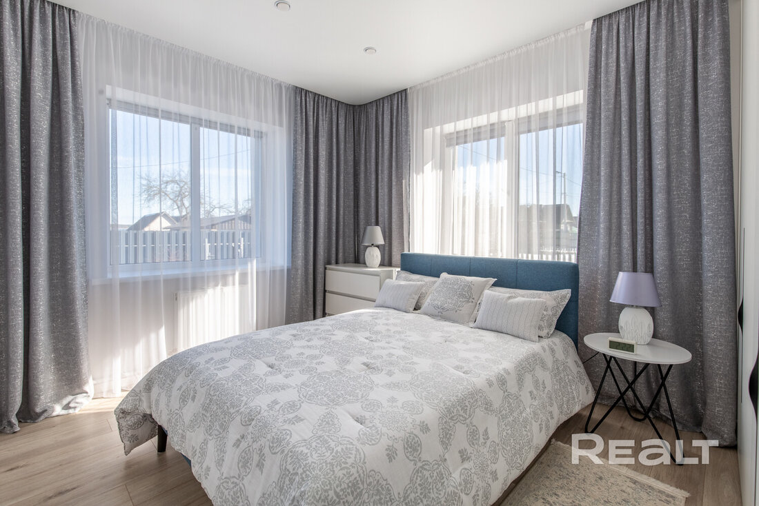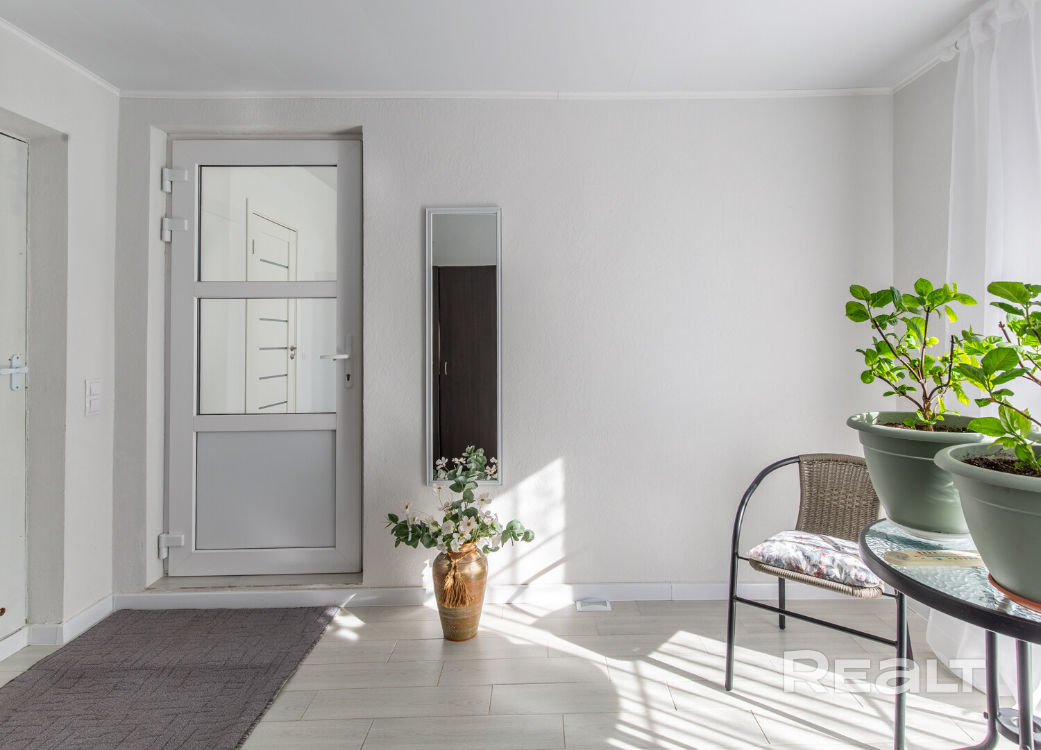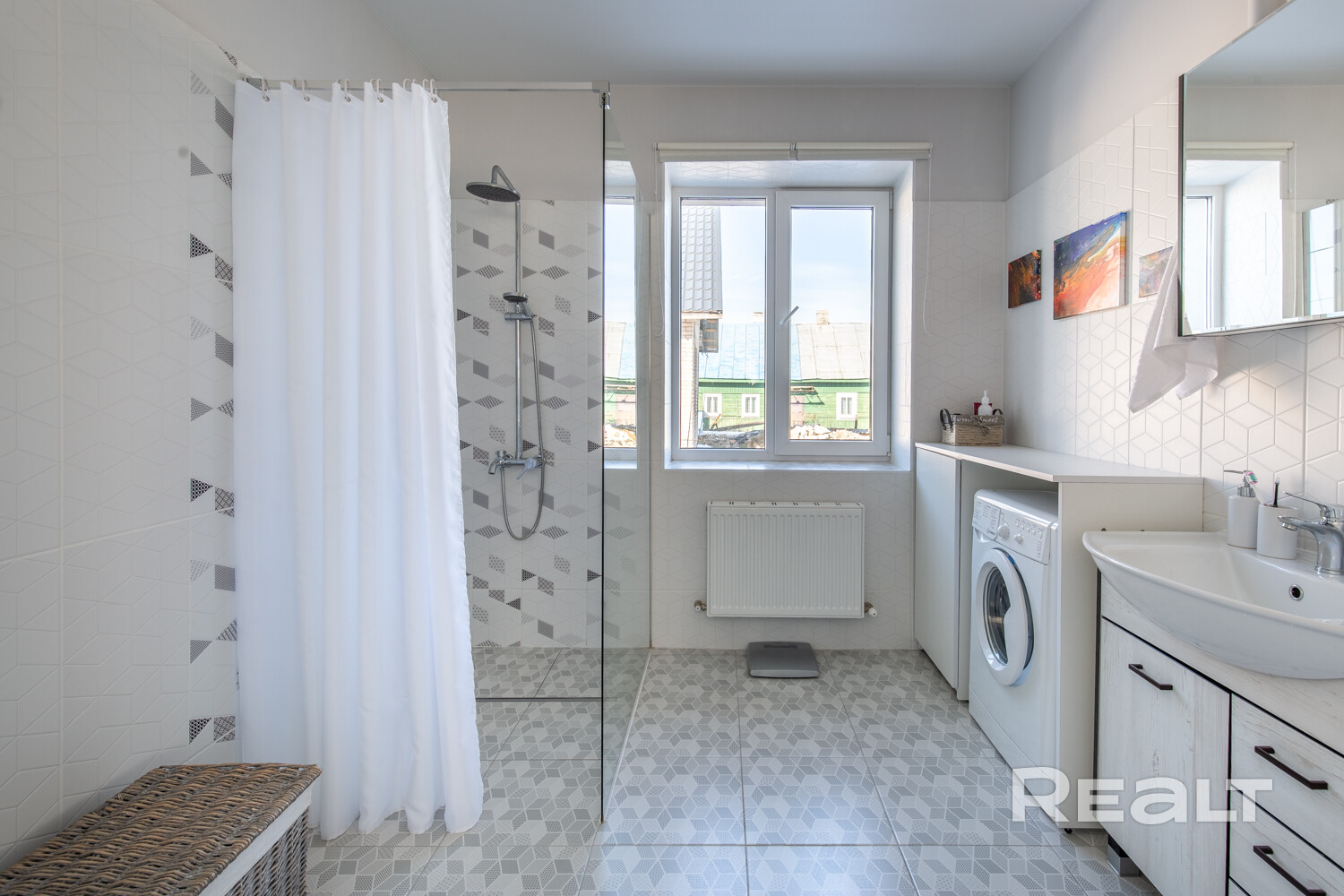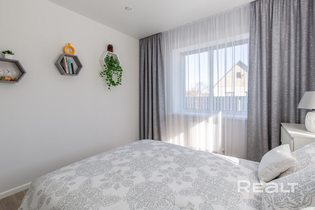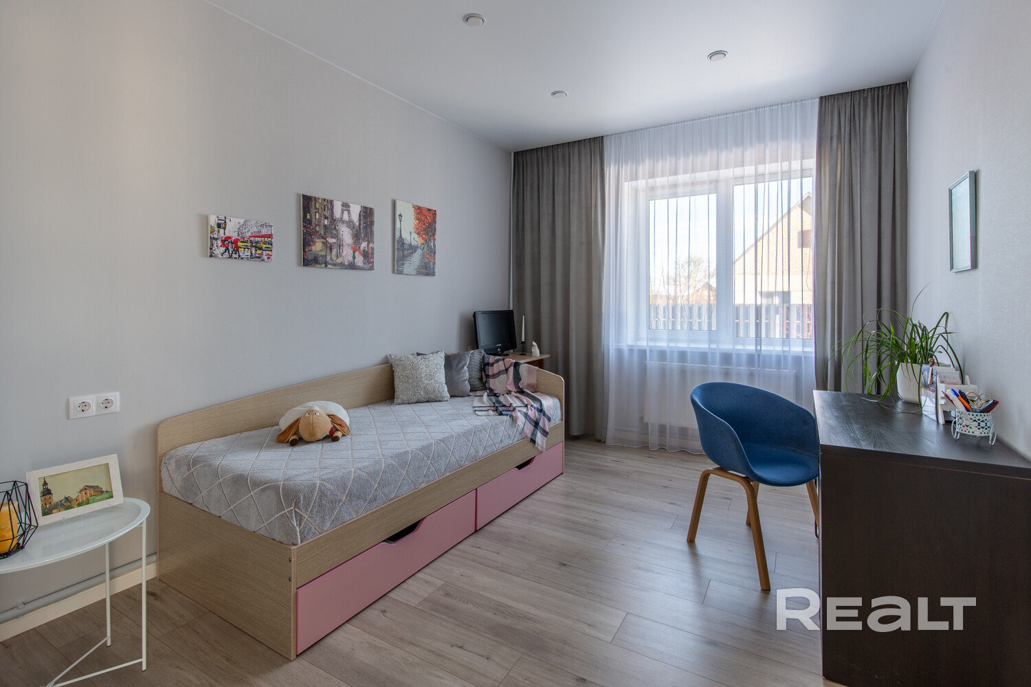 Общая площадь — 90,3 м². Планировка удобная: светлая прихожая, большой санузел, кухня-гостиная с добротной мебелью и бытовой техникой, две спальни. Отметим высокие потолки во всех помещениях.