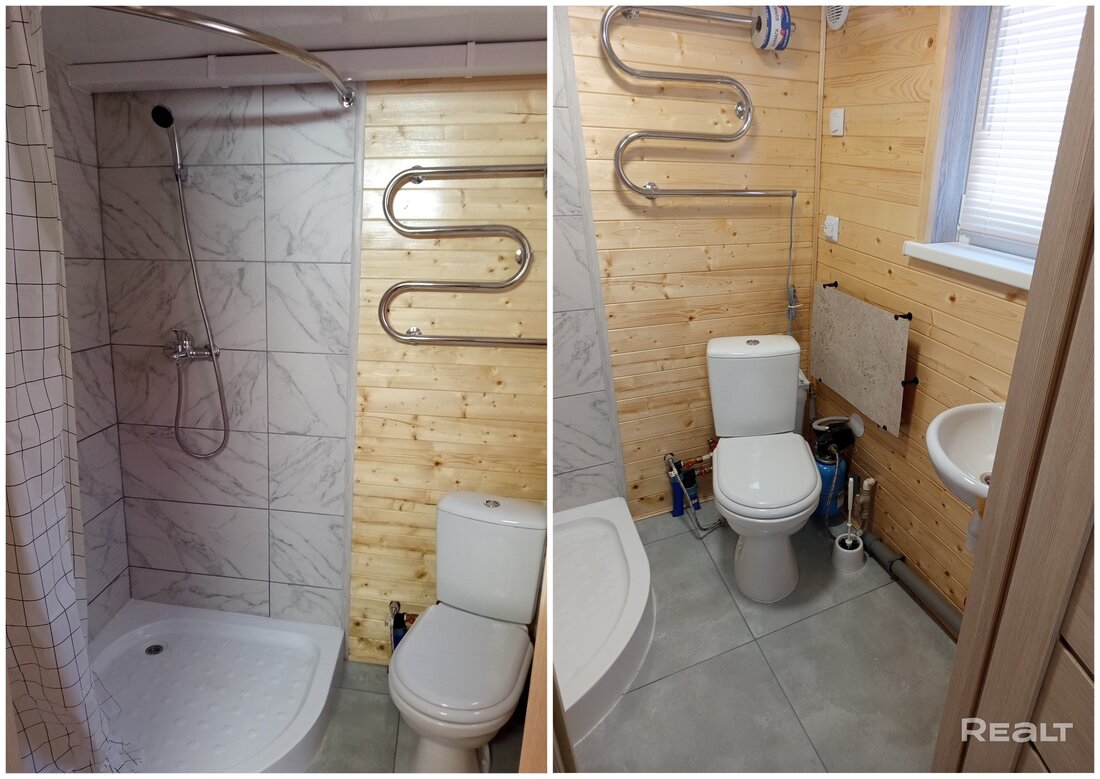 В отдельном помещении находится санузел. Тут уже есть душевая кабина, унитаз и раковина.