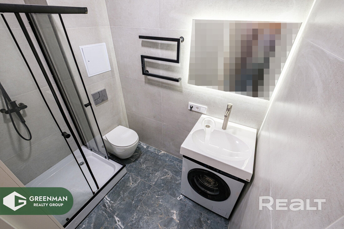 Санузел в однушке совмещенный. Под умывальником установлена стиральная машина, есть душевая кабина.