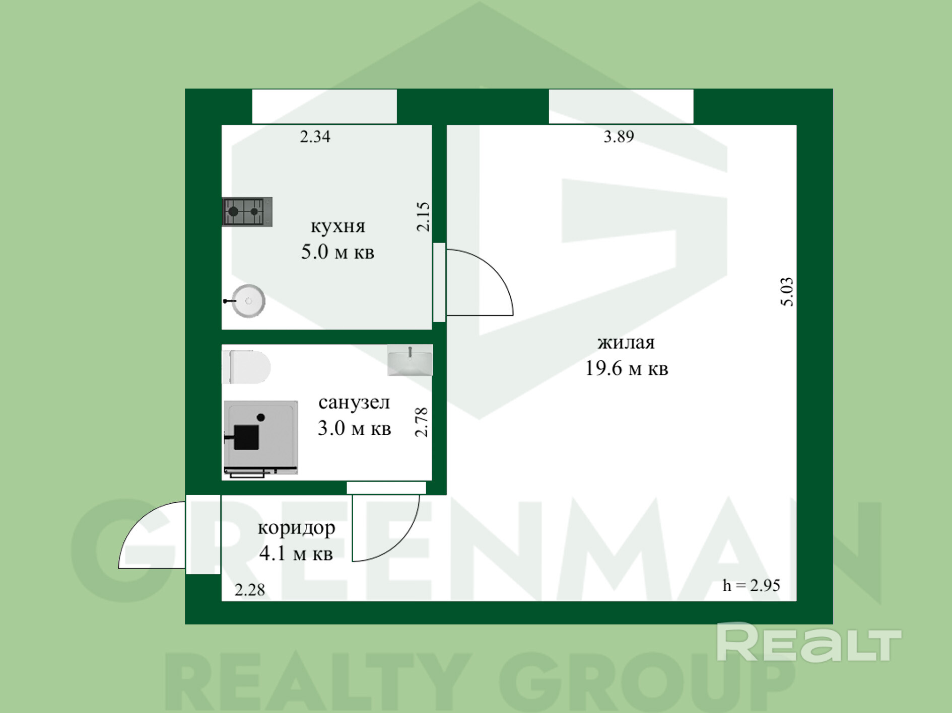 Общая площадь этой однокомнатной квартиры — 31 квадратный метр. Из них 20 квадратов приходится на жилую площадь, а еще 5 метров — это кухня.