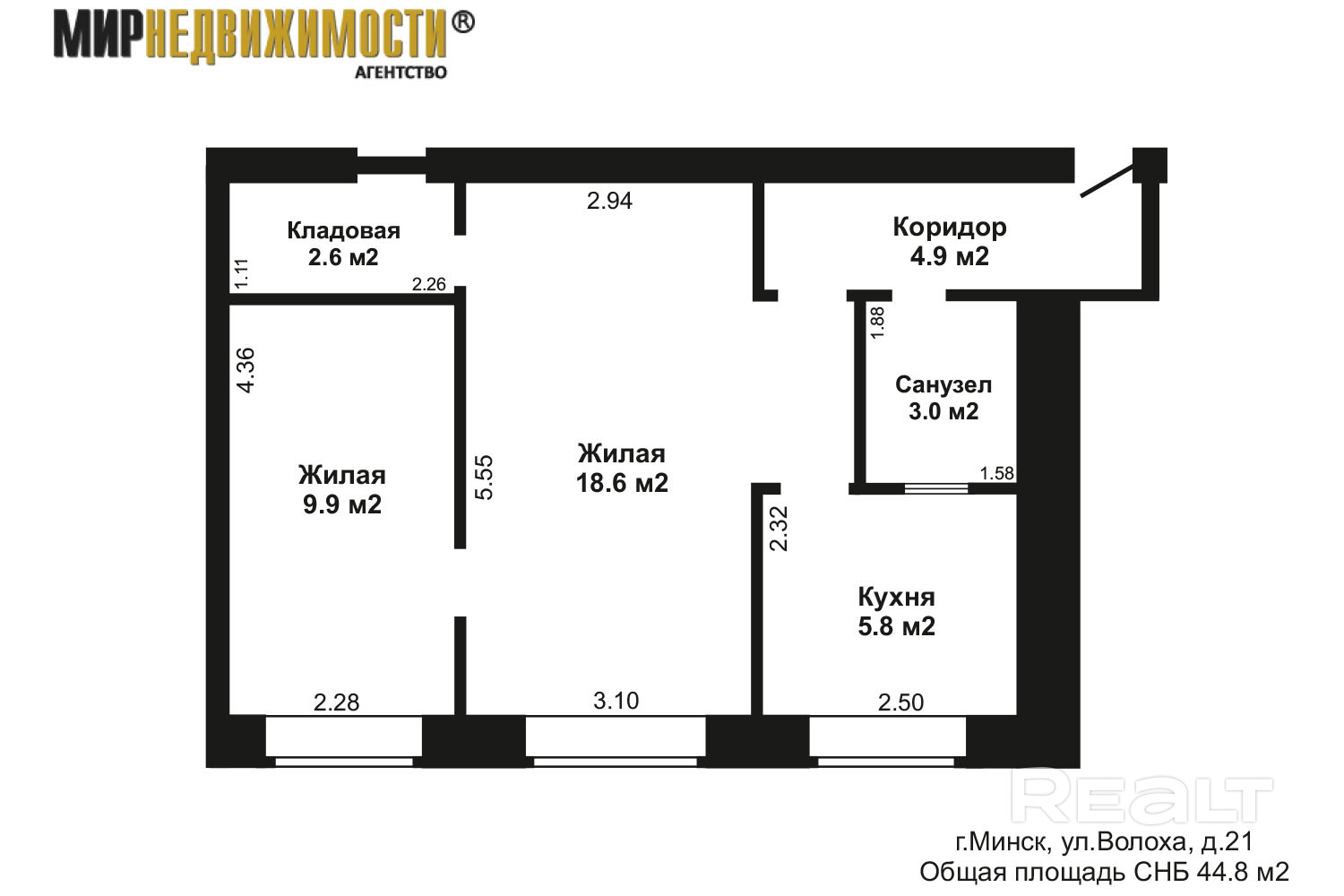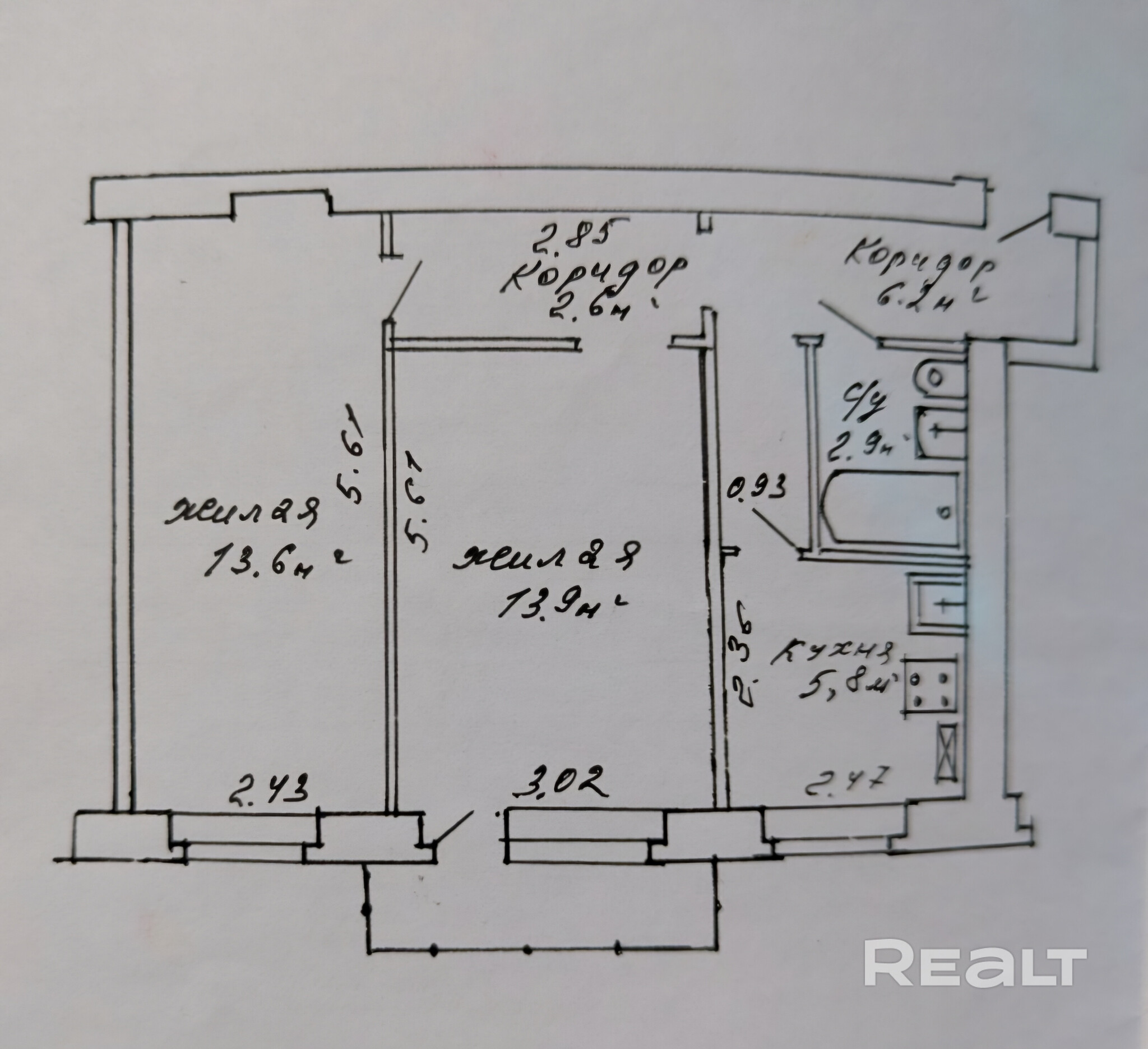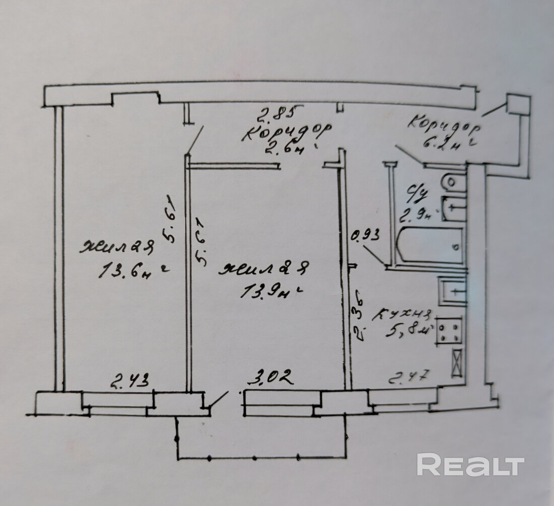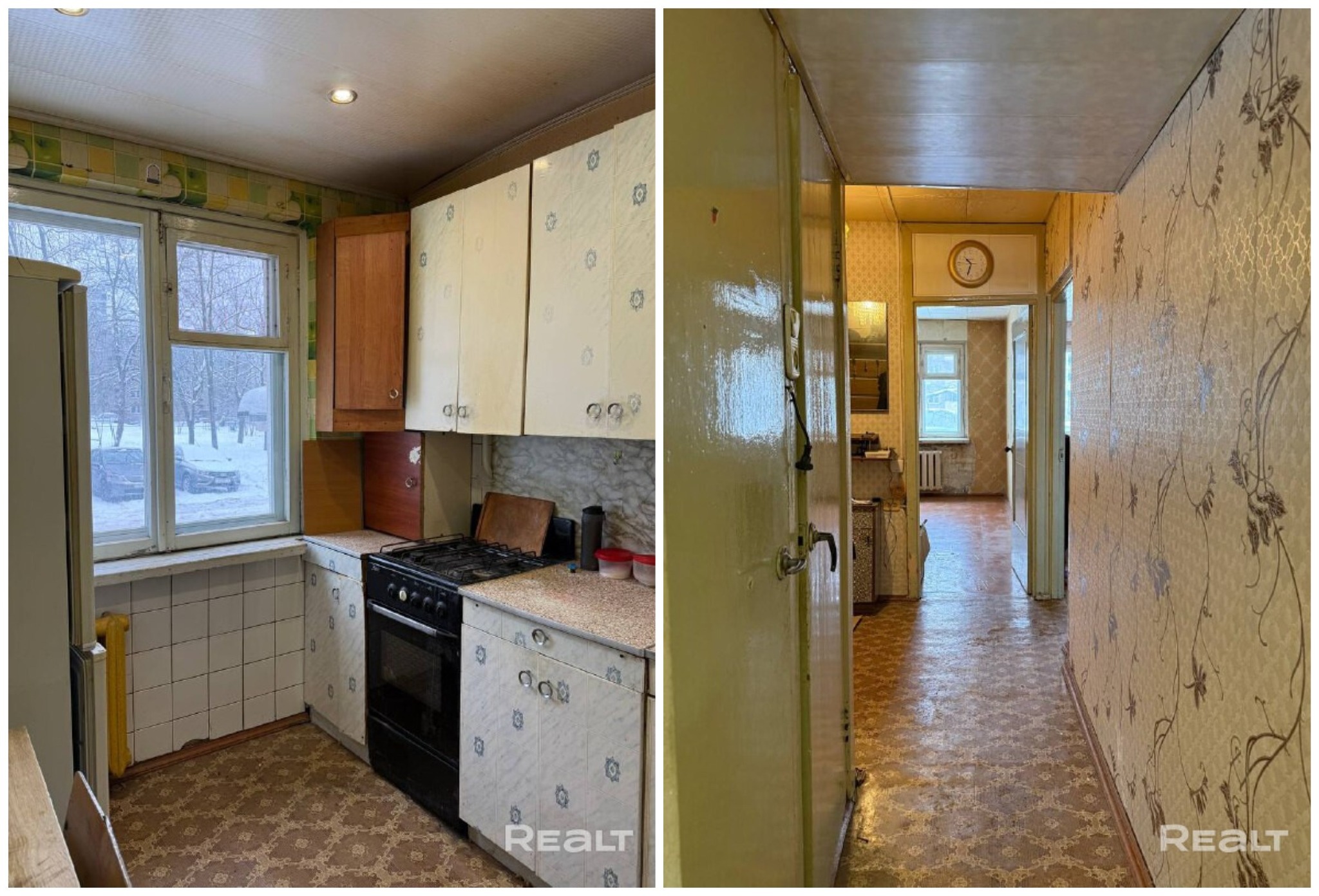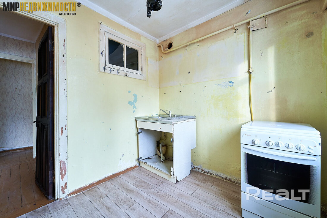 Первая квартира в подборке находится на первом этаже четырехэтажного дома на Волоха, 21. Хрущевку построили в 1960 году. Площадь двушки — 44,8 м², на кухню отведено 5,8 м².