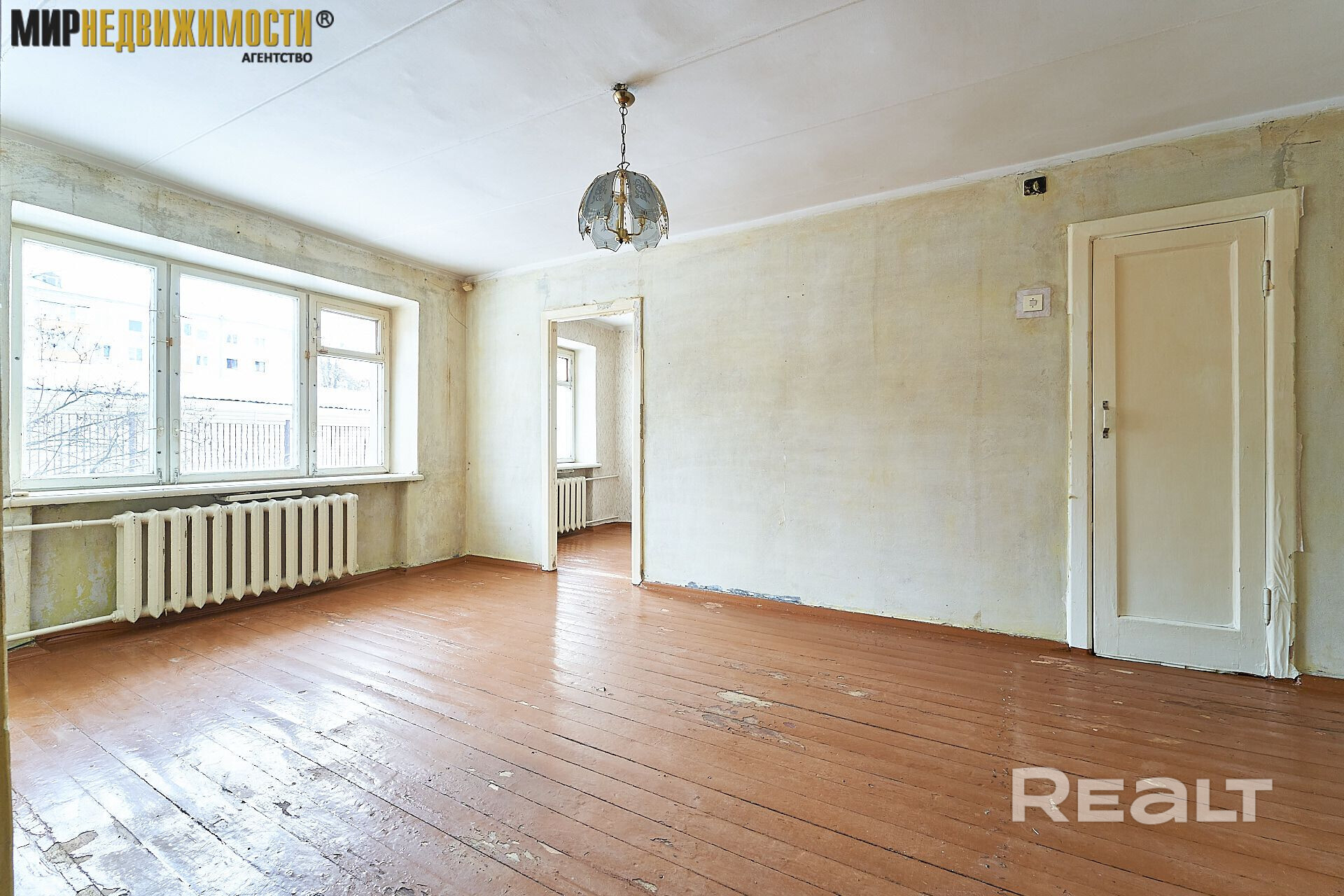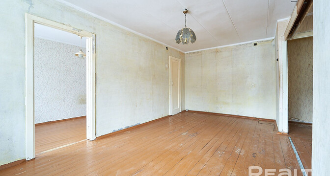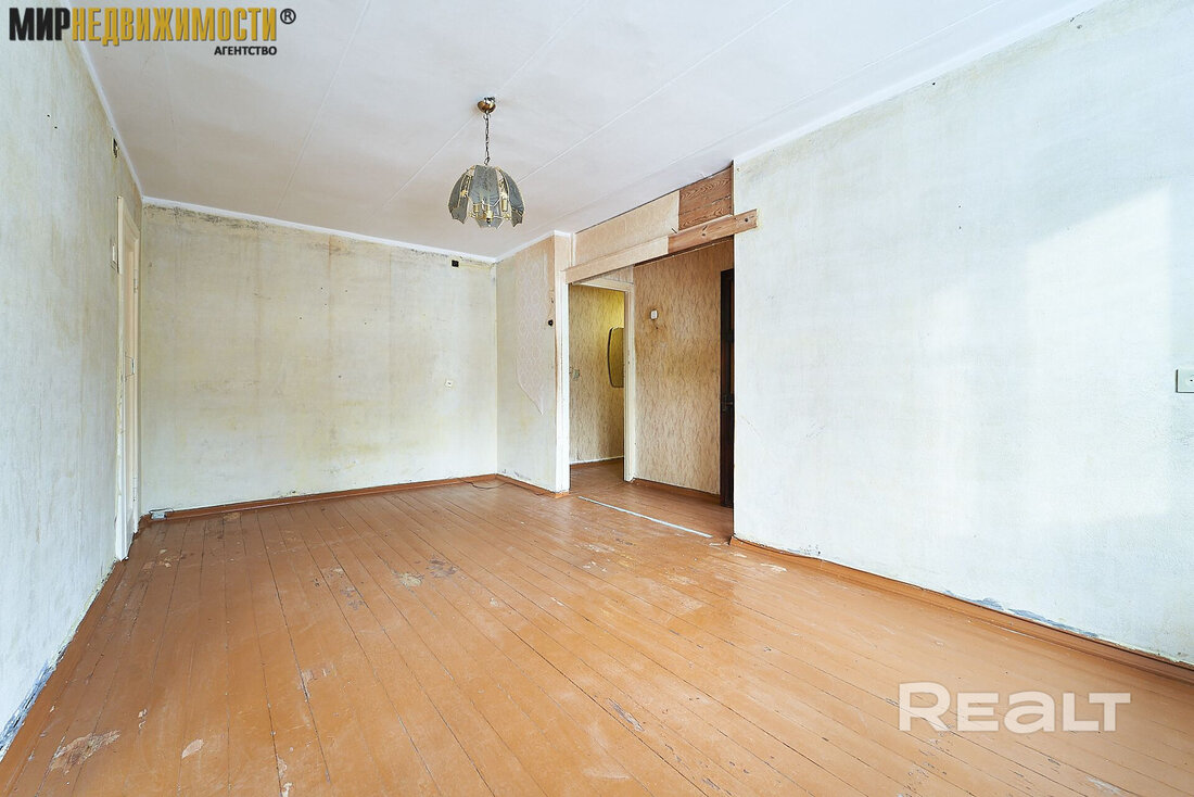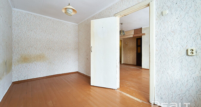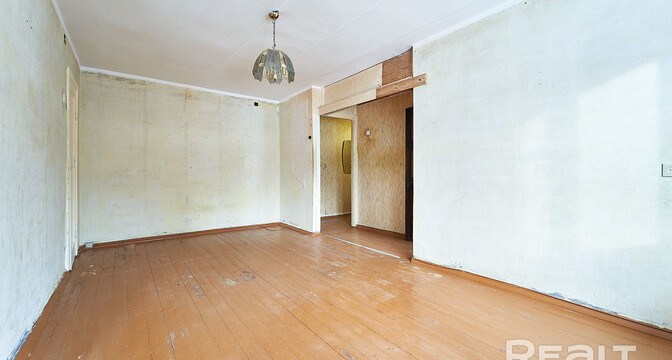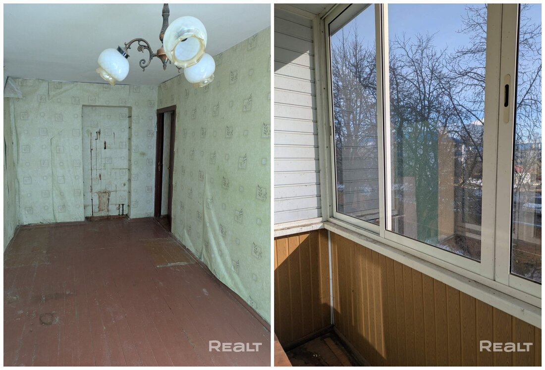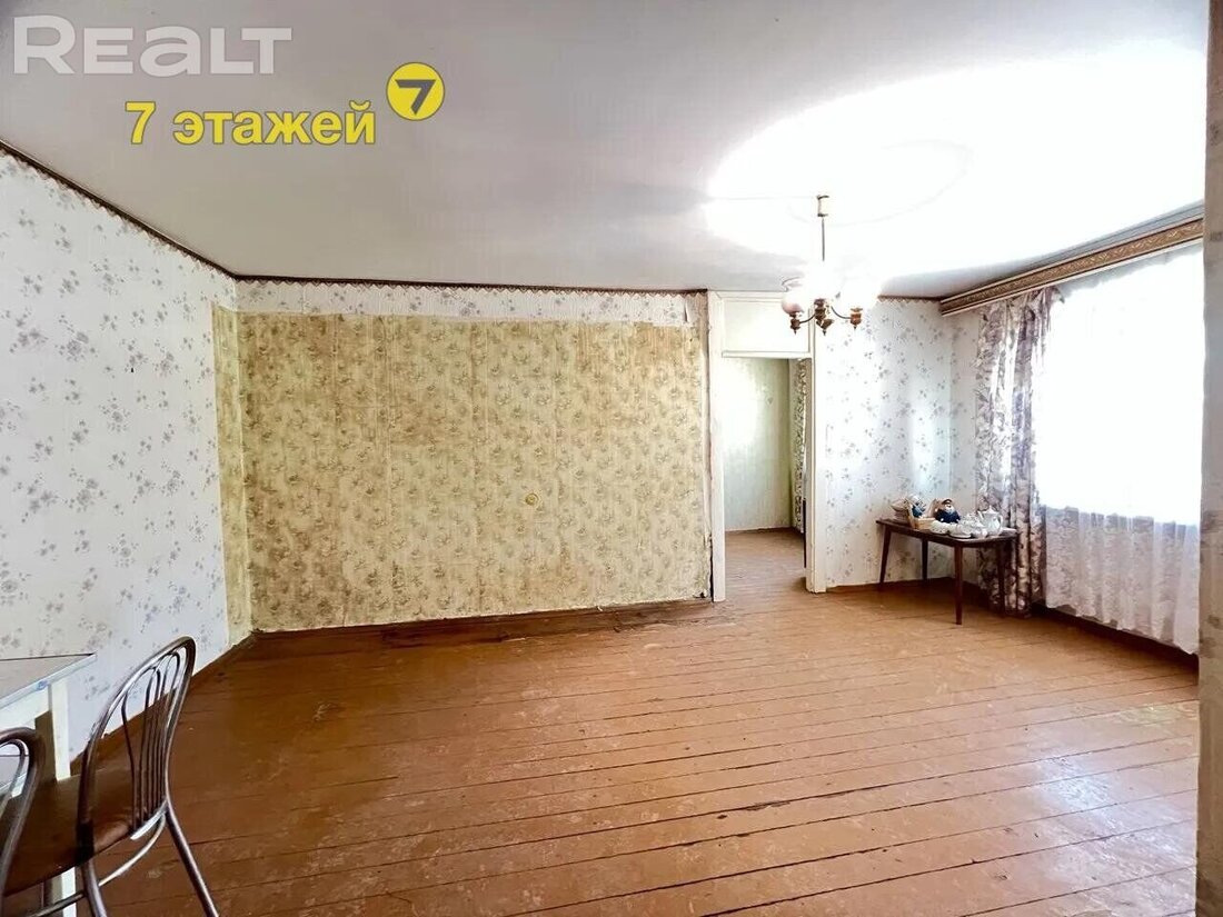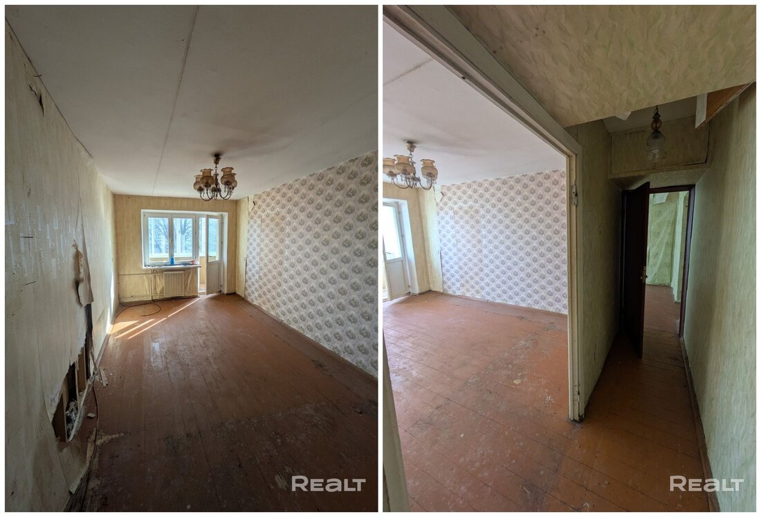 Жилье нуждается в ремонте. Здесь две изолированные комнаты. На полу лежат доски, стены в обоях. Из гостиной есть выход на застекленный балкон.