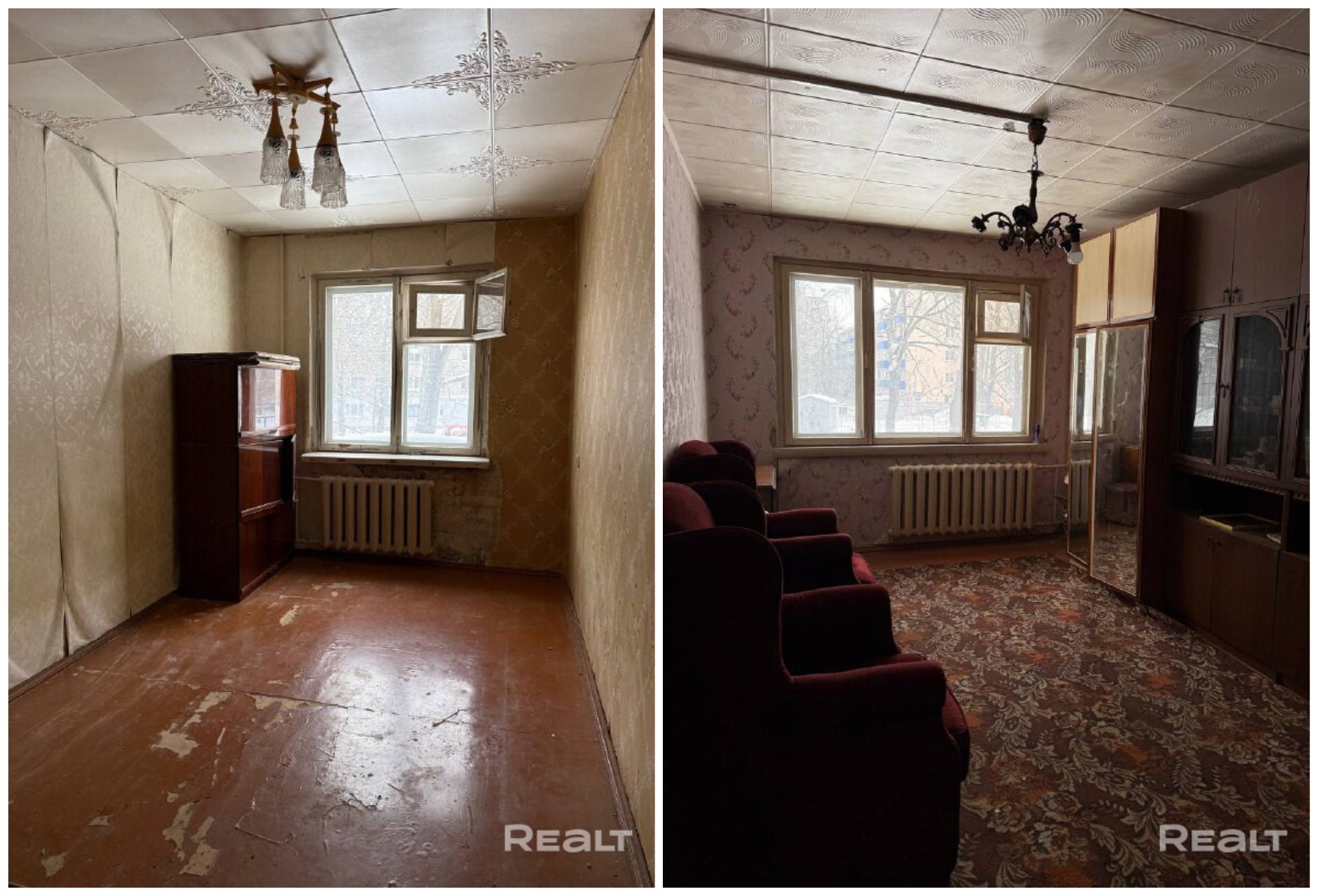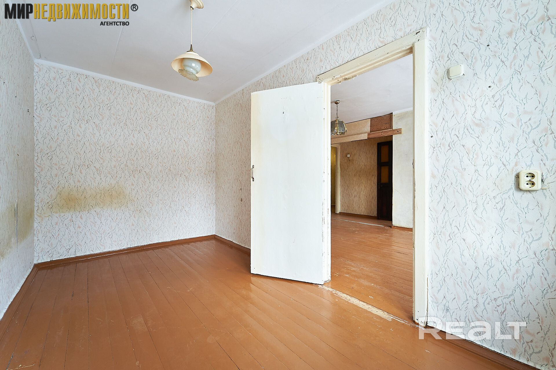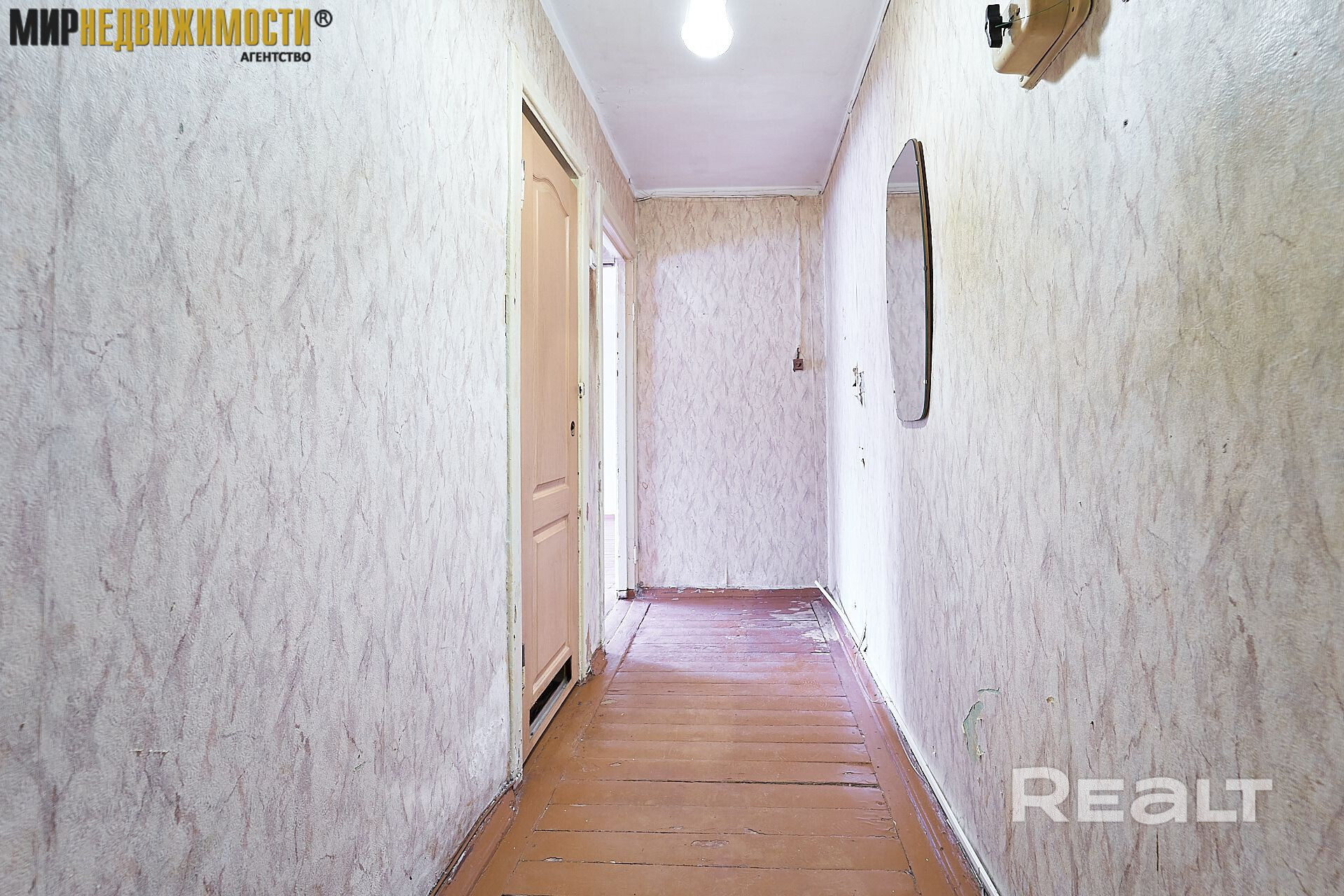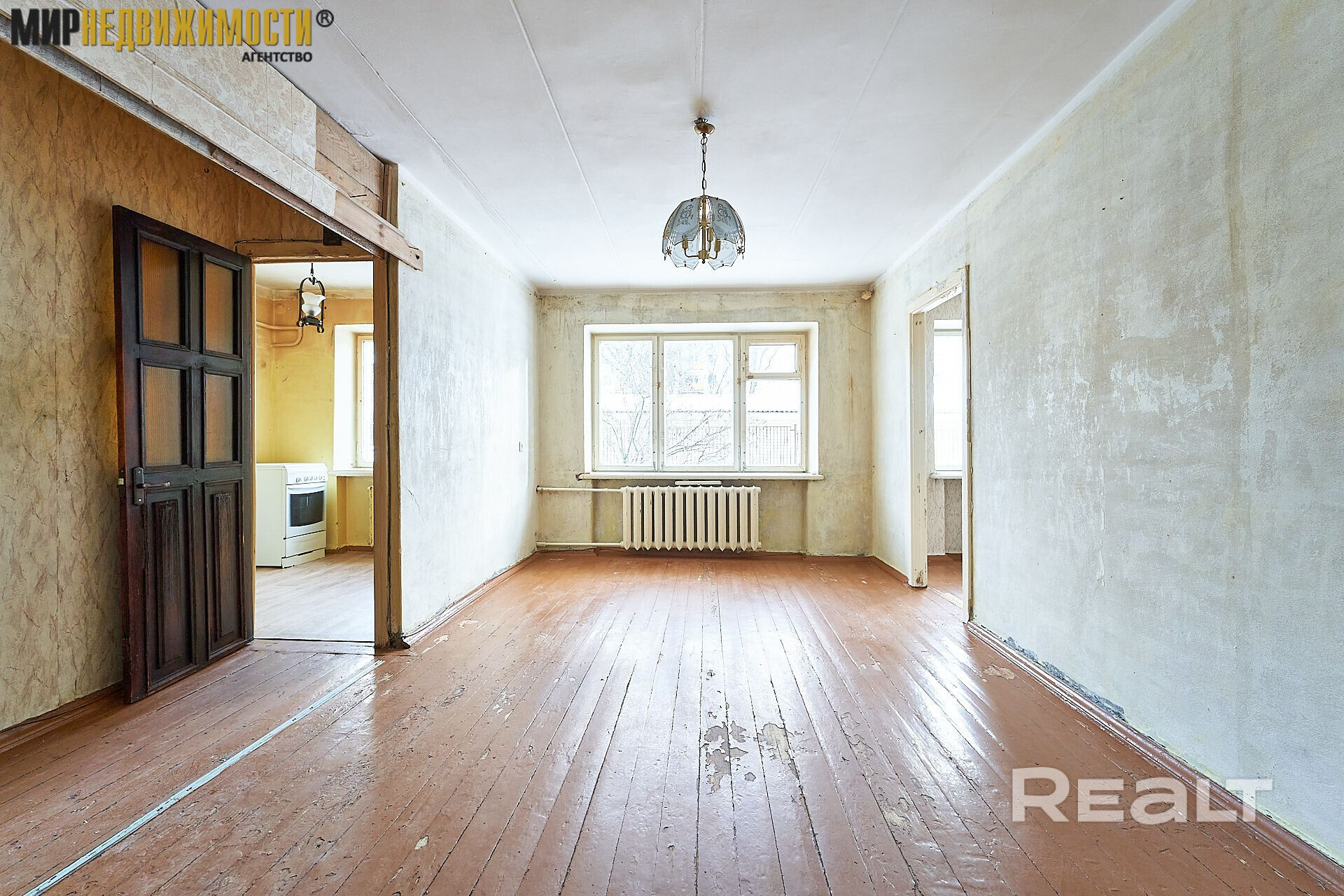 Жилье нуждается в ремонте. Здесь две изолированные комнаты. На полу лежат доски, стены в обоях. Из гостиной есть выход на застекленный балкон.