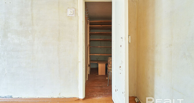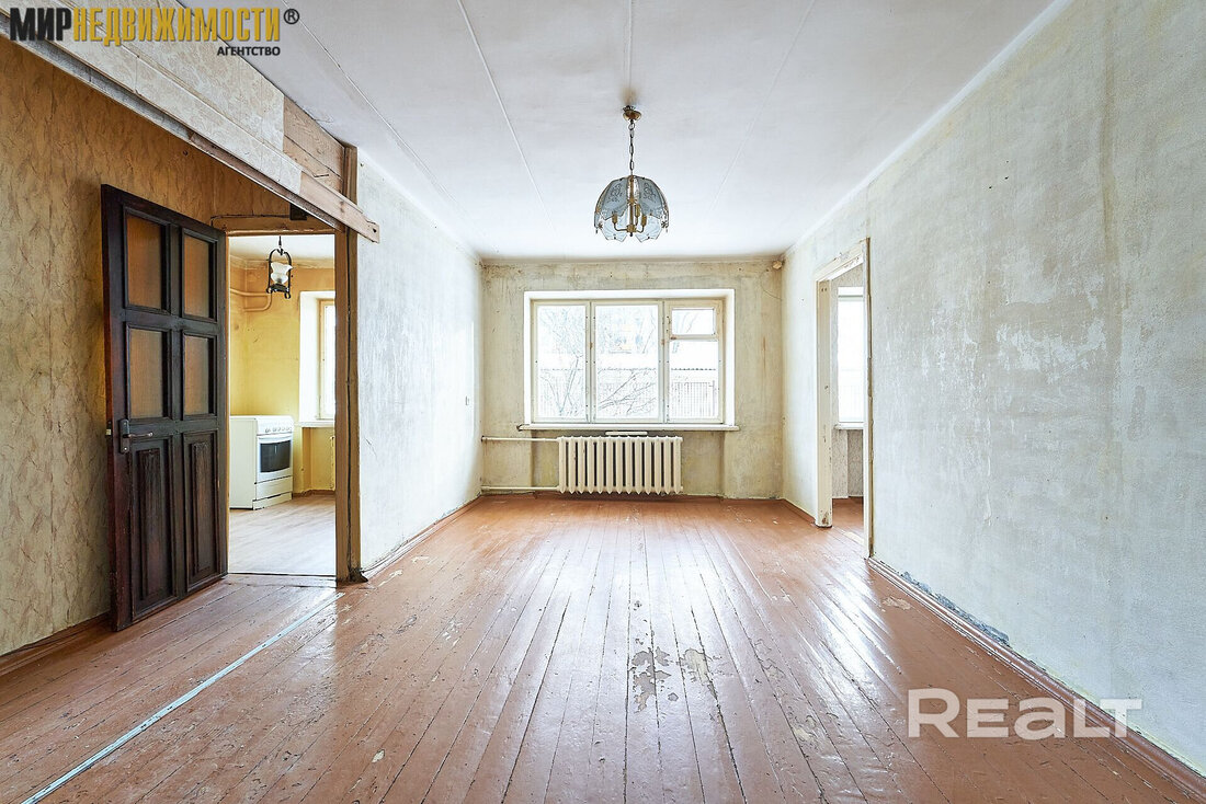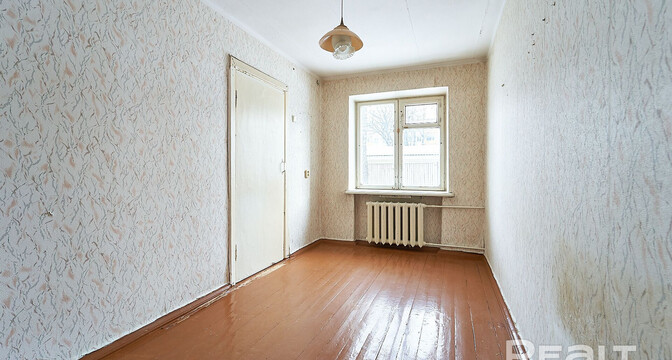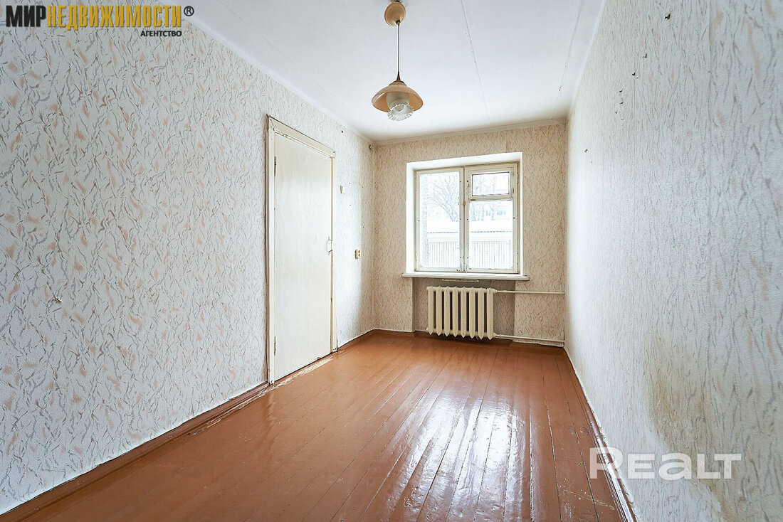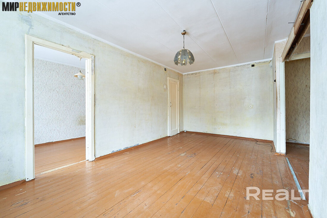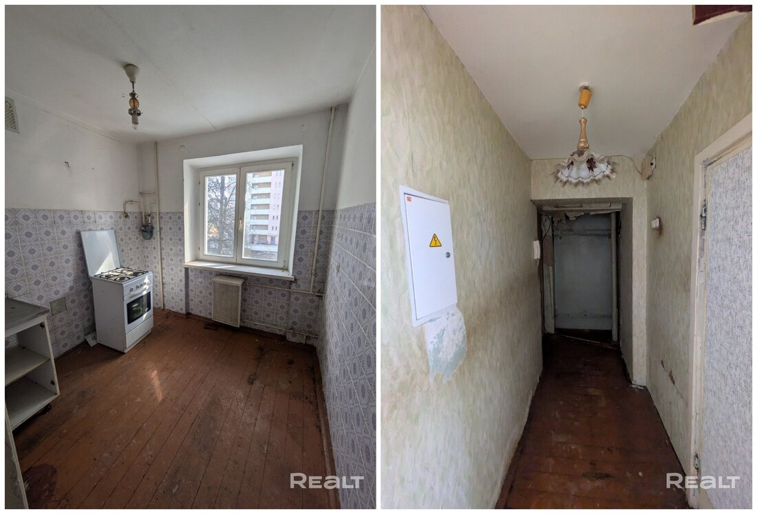 Квартира выставляется под ремонт. Она практически пустая. На полу тут лежат доски и плитка, стены оклеены обоями, а в окнах стоят стеклопакеты. Одна из комнат — проходная. Балкона нет.