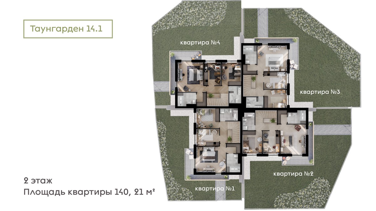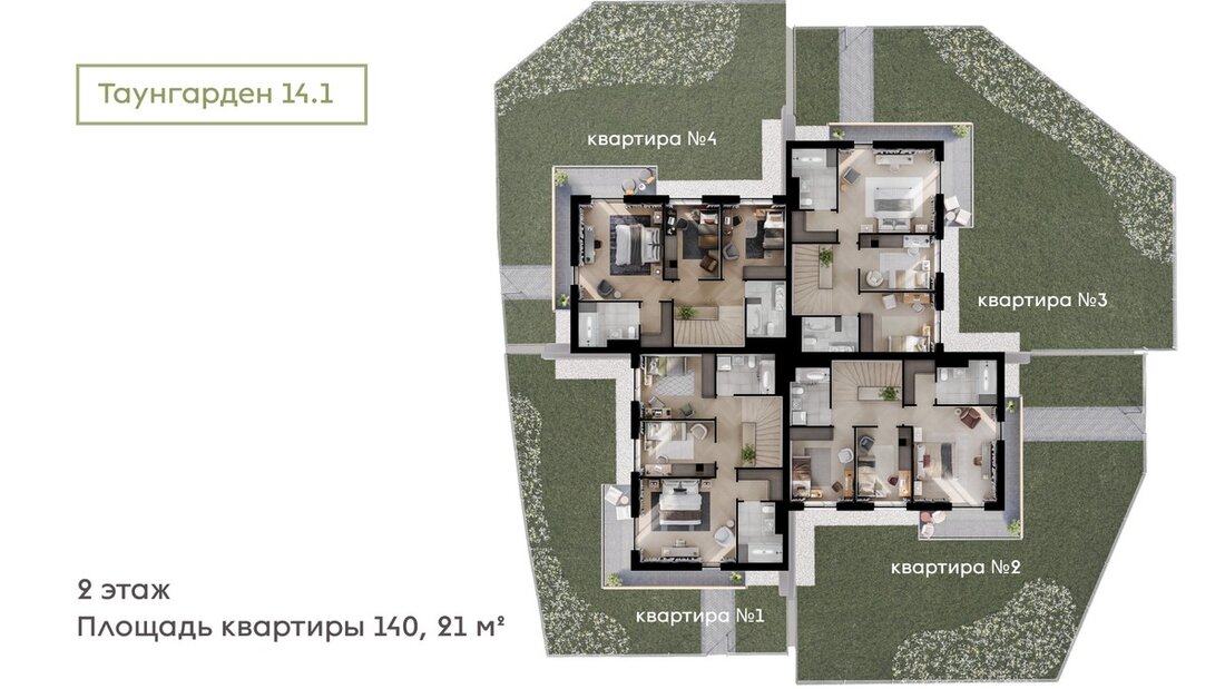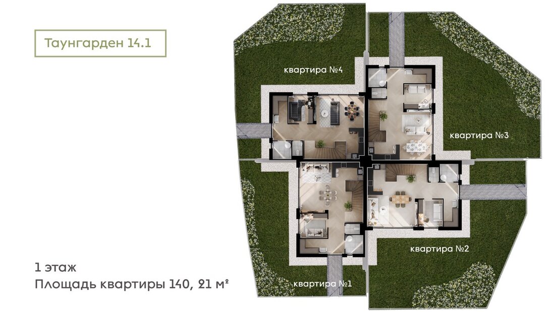 Площадь каждой квартиры составит 140 квадратных метров без учета балконов. Высота потолков на первом этаже составляет 3,05 метра, на втором — ровно 3 метра. Архитекторы предоставили свободу действий в создании индивидуального интерьера.