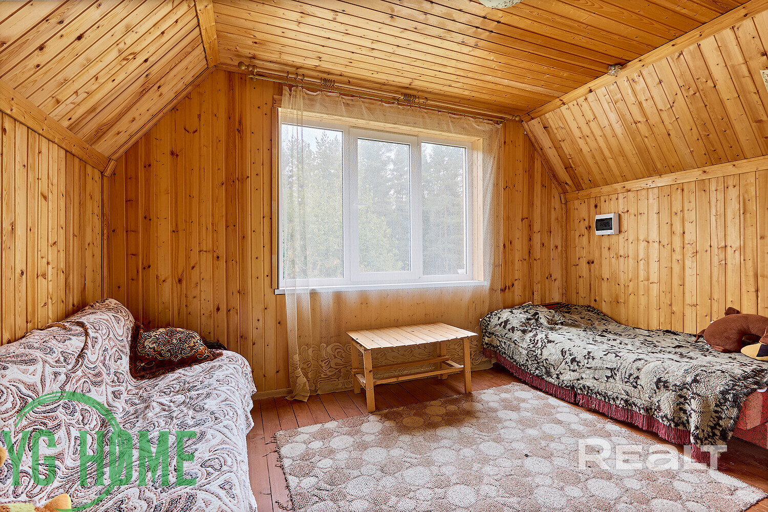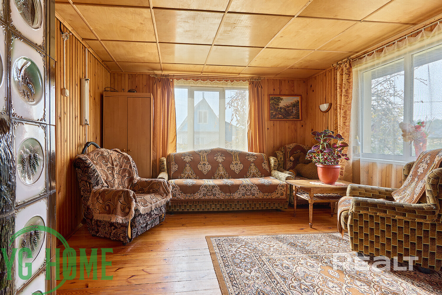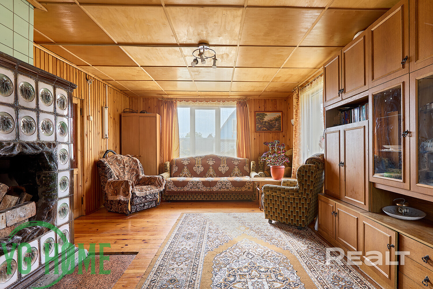 Внутри дома — уютное дачное ретро с вагонкой на стенах, советской мебелью и коврами.
