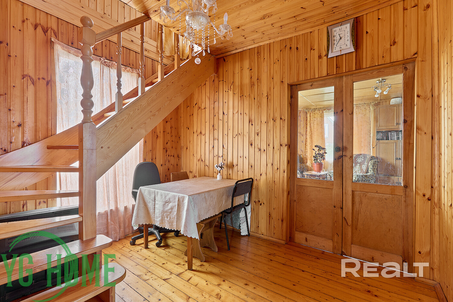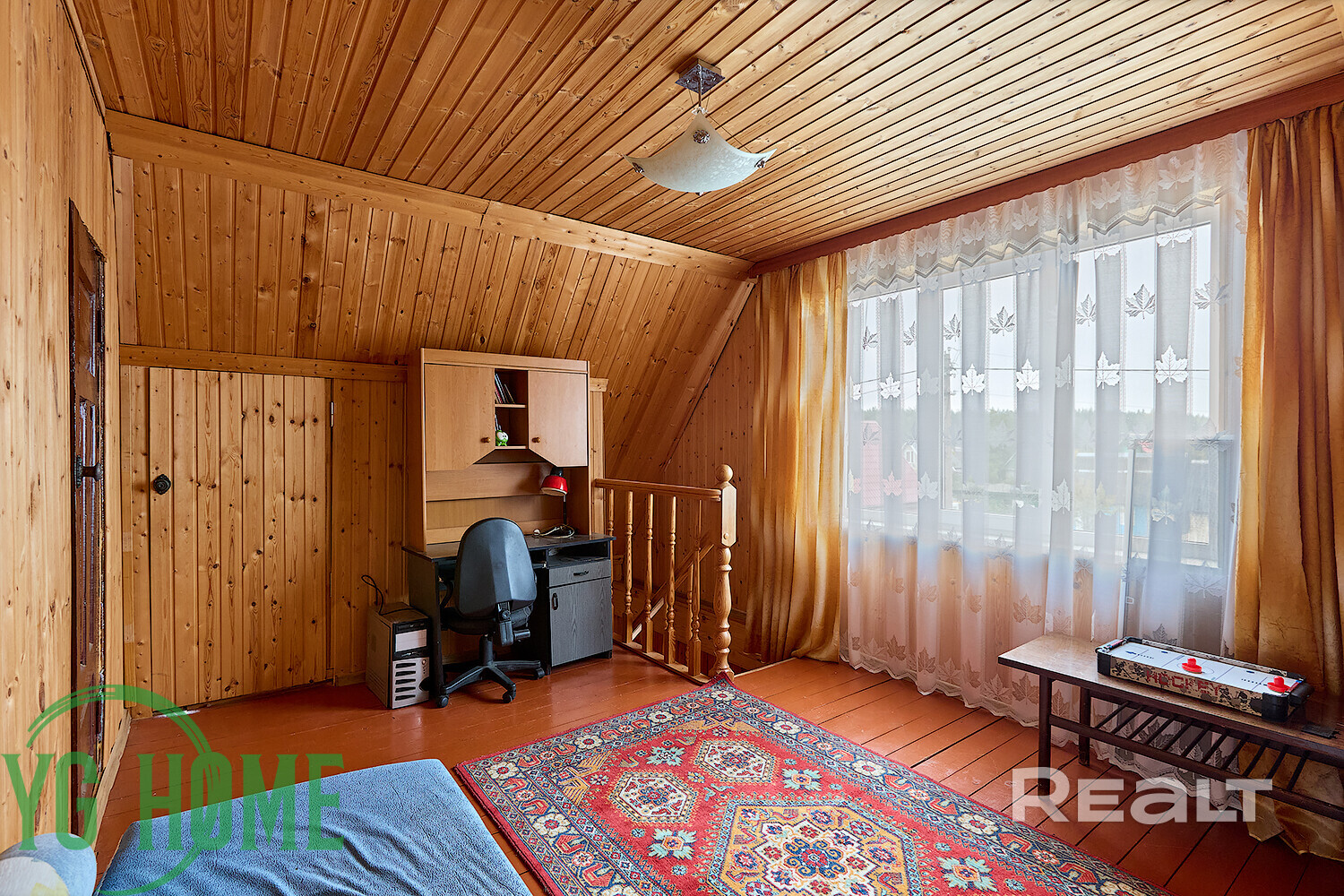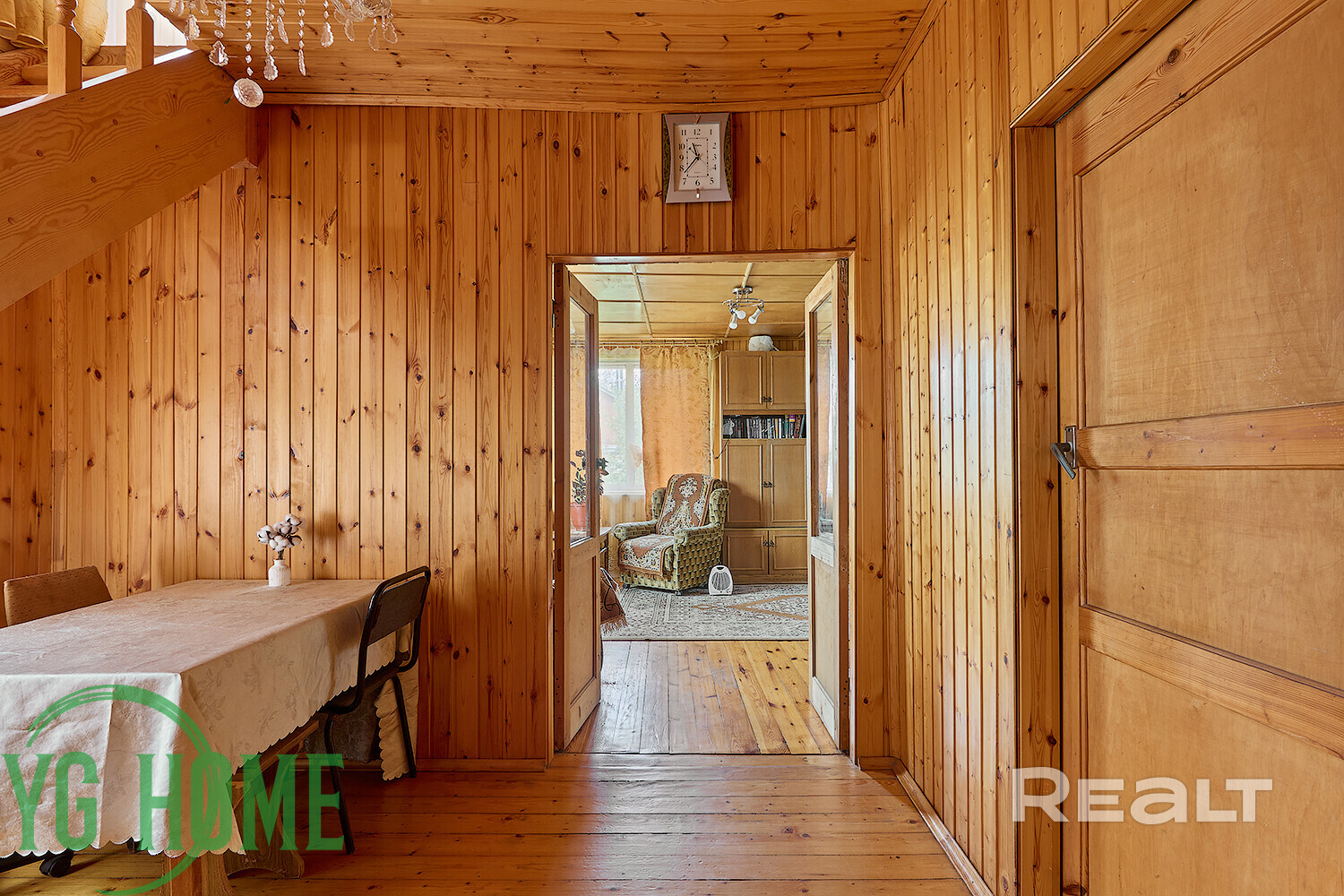 Внутри дома — уютное дачное ретро с вагонкой на стенах, советской мебелью и коврами.
