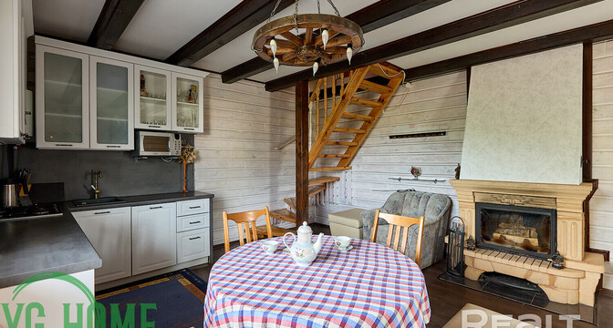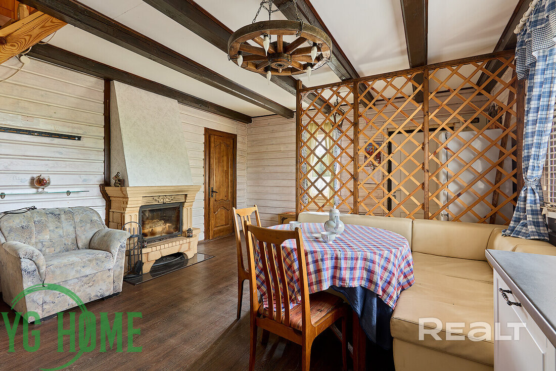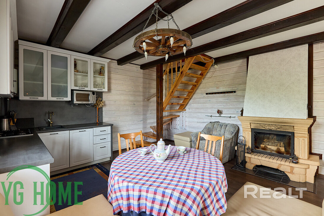 На первом этаже в доме большая гостиная комната и просторная кухня. В кухне из техники есть посудомойка и бойлер. В гостиной — камин.