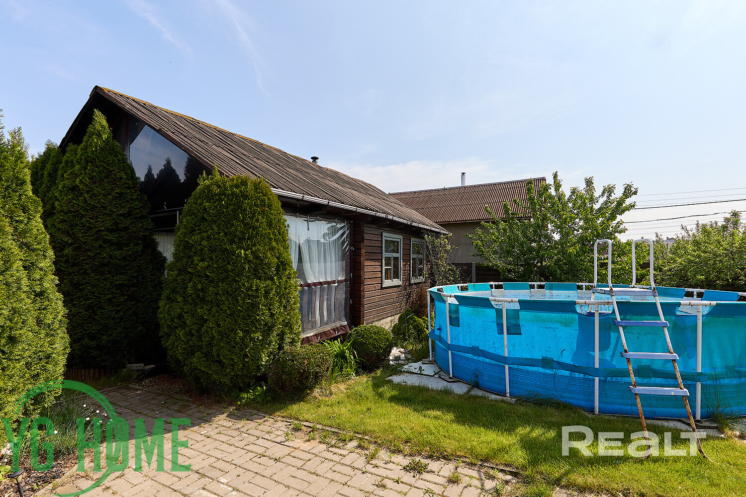 Около бани установлен каркасный бассейн.