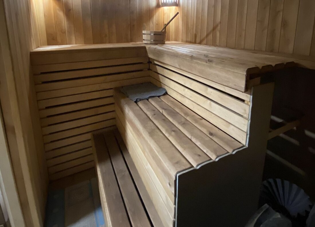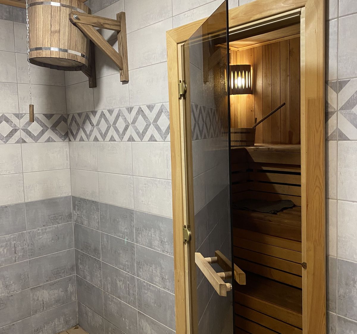 Рядом стоит баня из газосиликатных блоков. Строение утеплено, обшито сайдингом. Перекрытия утеплены минеральной ватой 200 мм. Окна ПВХ двухкамерные, нергоэффективные. На крыше — металлочерепица. Внутри на полах плитка.