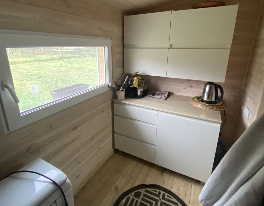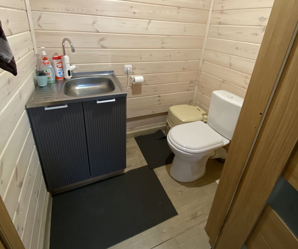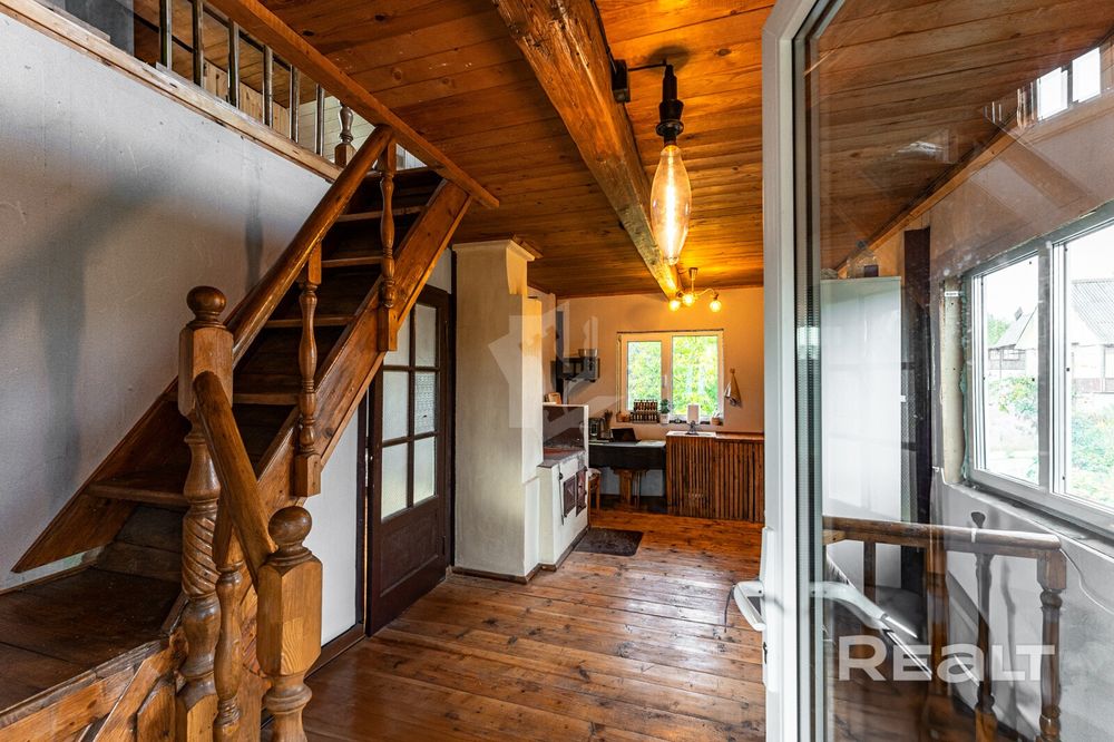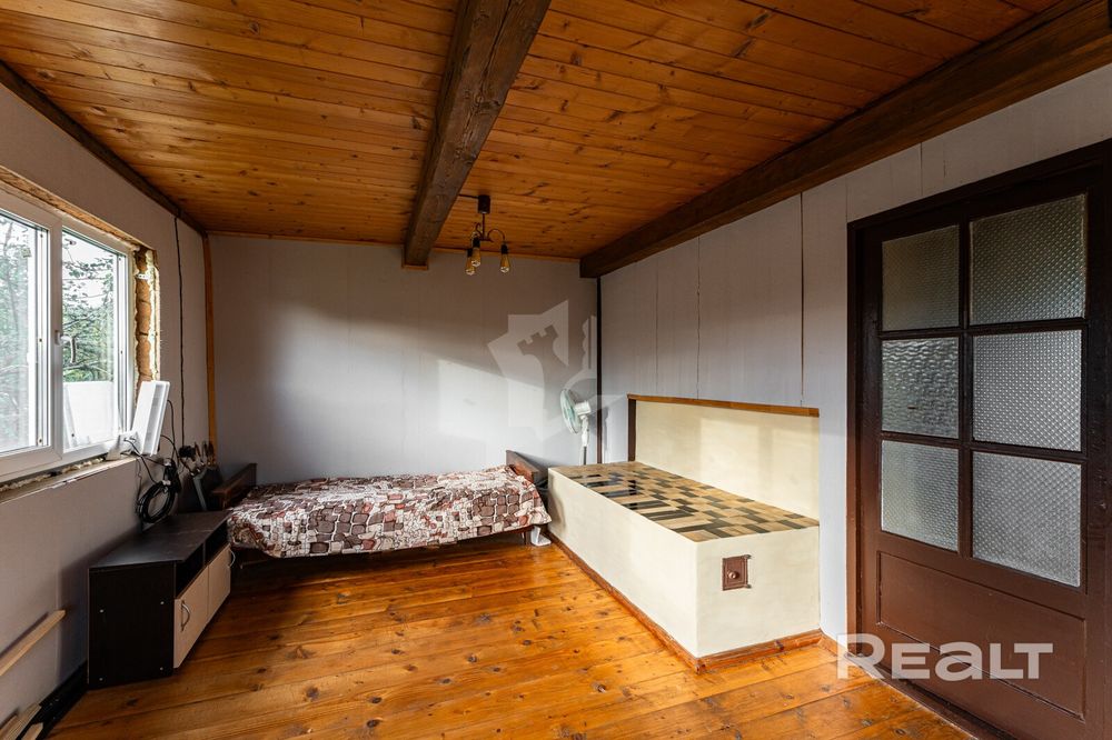 Дом здесь деревянный, построен в 1991 году. Это компактное строение — всего 33,9 м2. На первом этаже находятся кухня, общая комната и санузел, на втором — спальня.