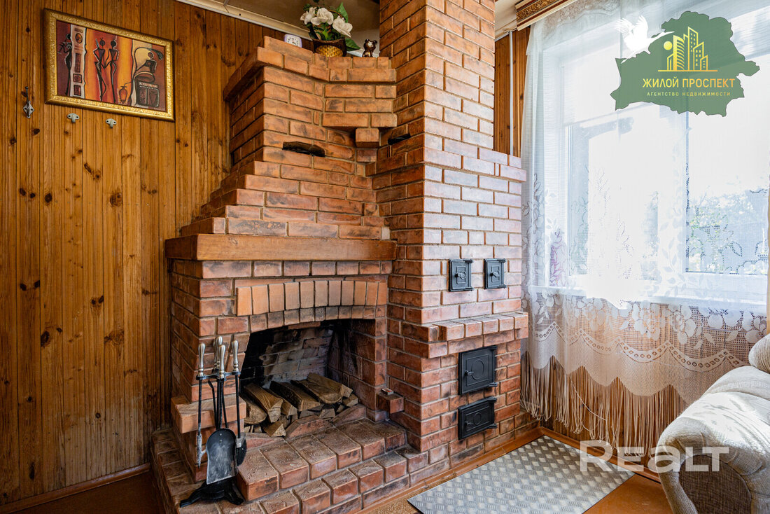 На первом этаже расположены кухня, прихожая, две большие спальни с камином и печкой, санузел.