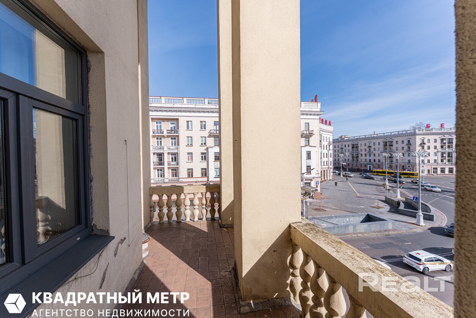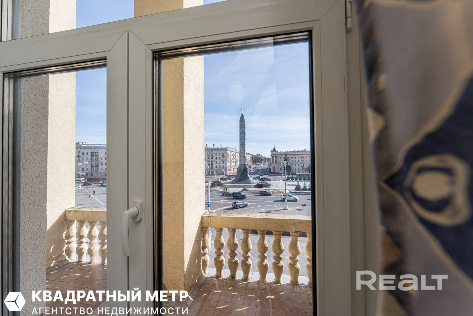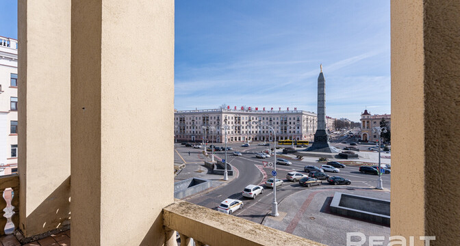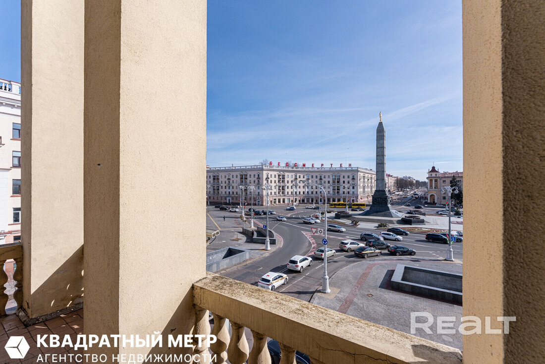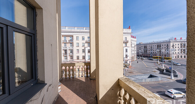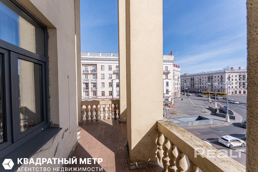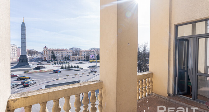 Квартира находится прямо на площади Победы, а из окон виден Вечный огонь. Фишка этой квартиры — уникальный угловой балкон. Вот этот.