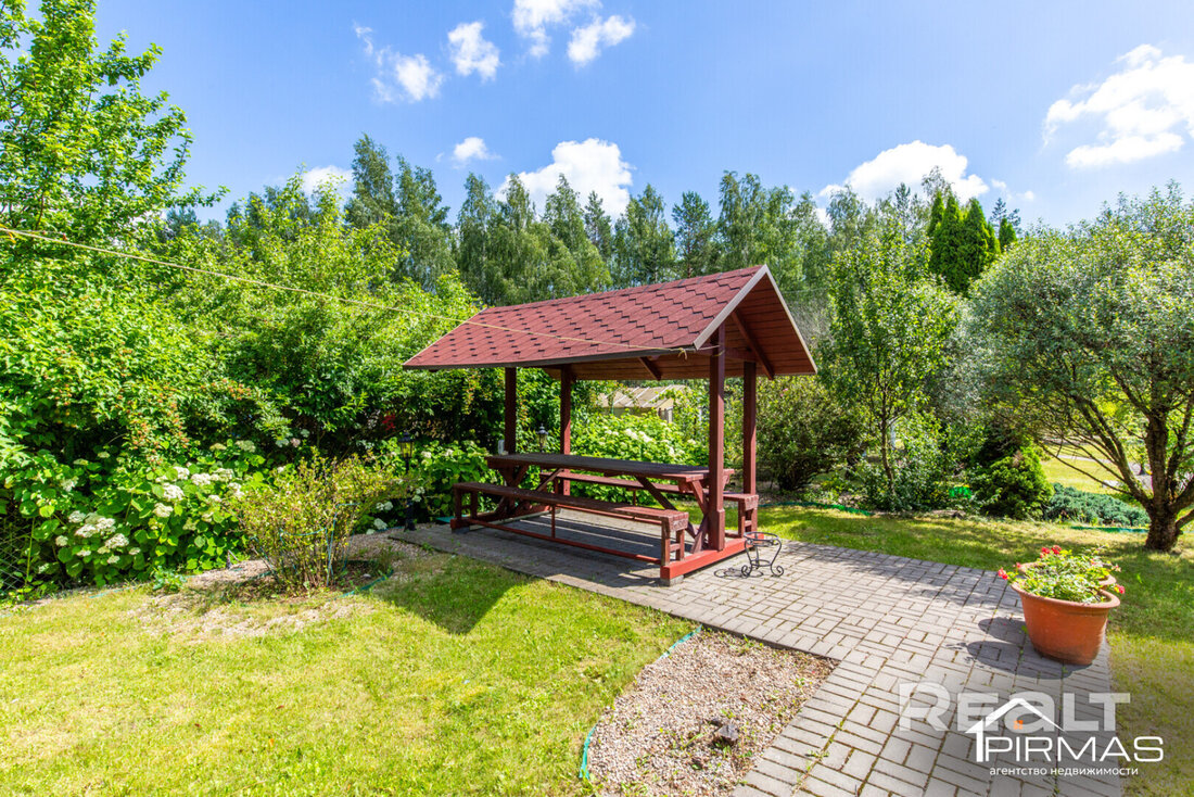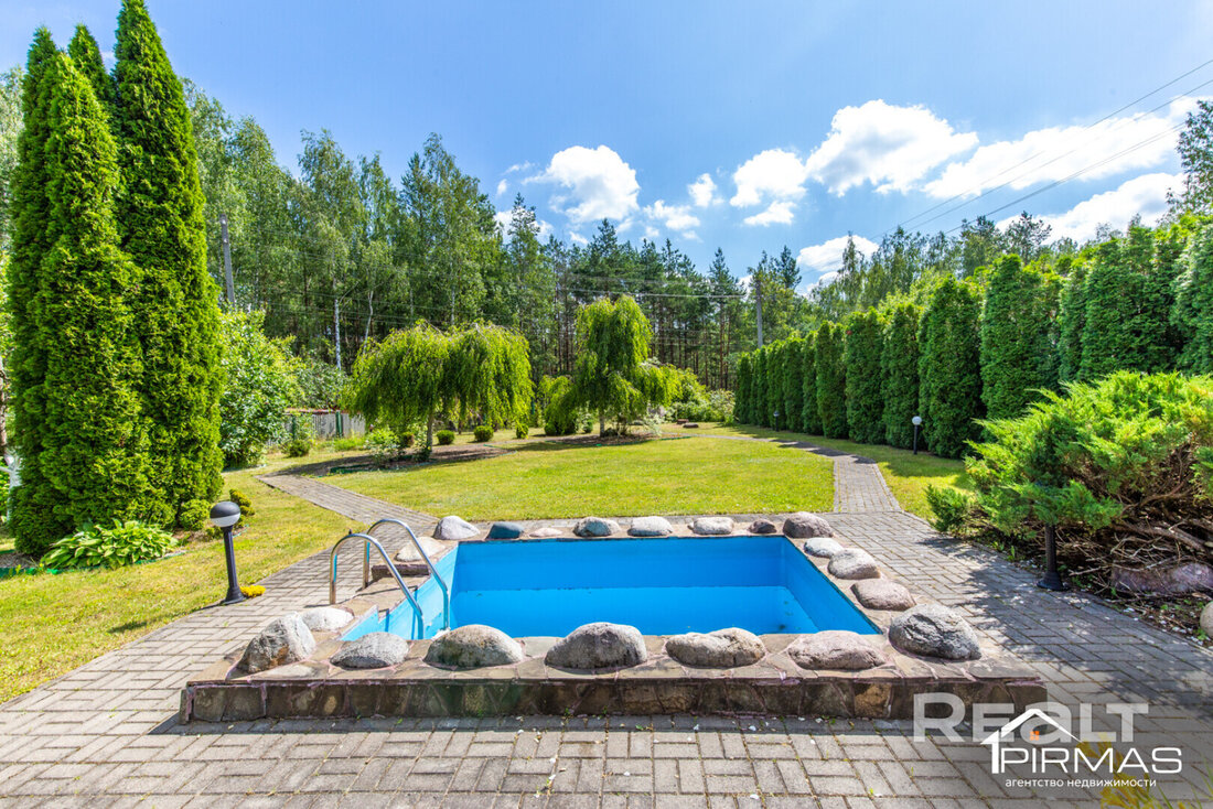 Дача стоит на крайнем участке с выходом прямо к сосновому лесу. Территория в 13 соток огорожена забором и живой изгородью из туй. На участке есть бассейн, зона барбекю, стоянка для двух автомобилей и гараж с садовой техникой.