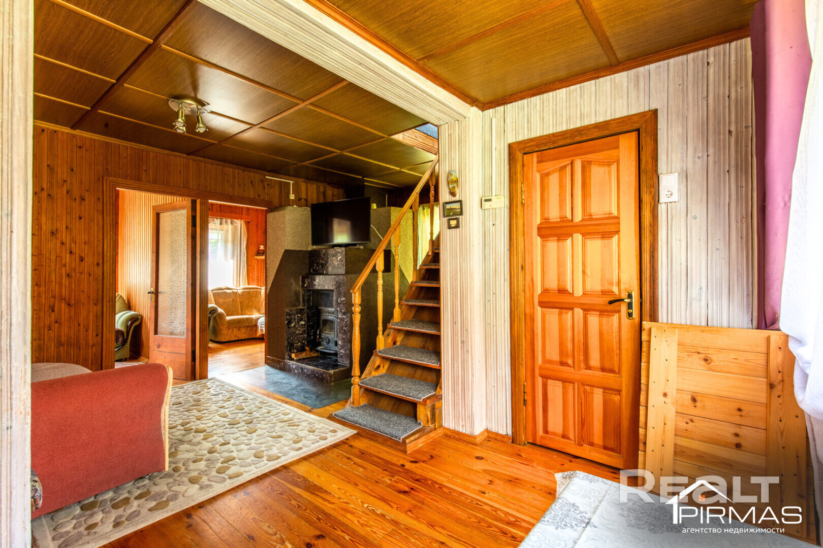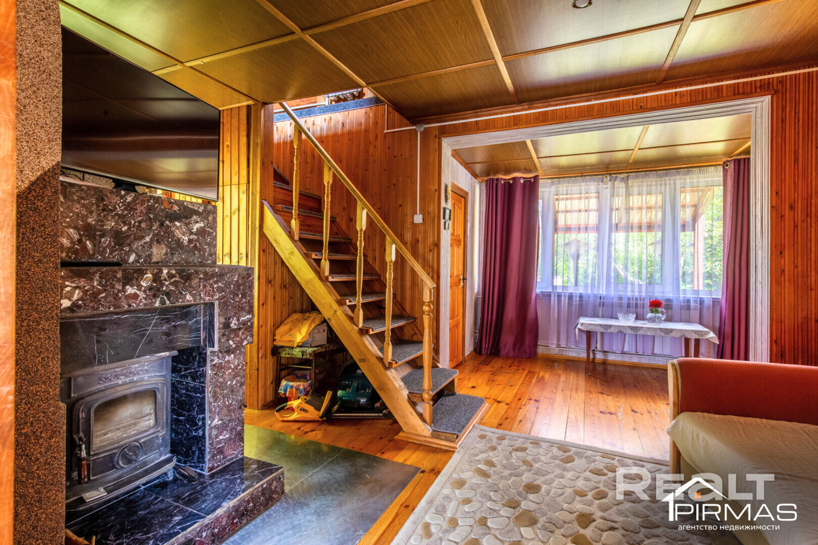 На первом этаже дачи расположилась гостиная с камином и лежанкой, кухня и две жилые комнаты. Все помещения полностью обставлены мебелью. В интерьерах много дерева.