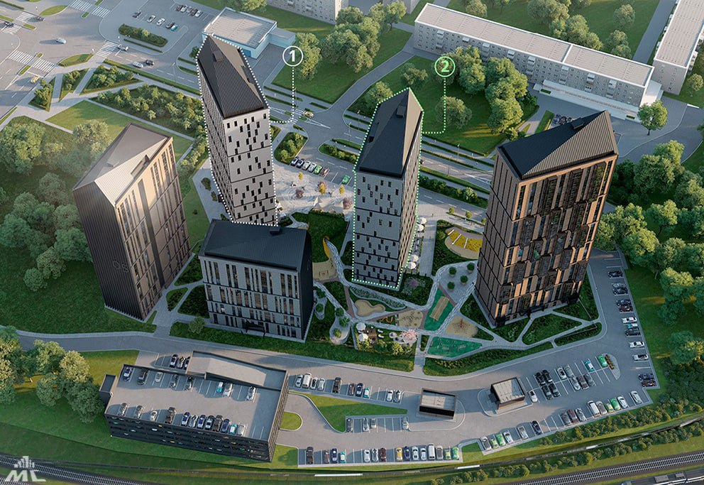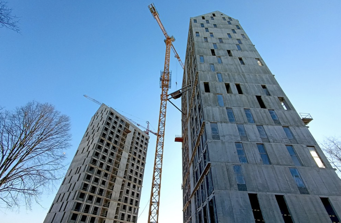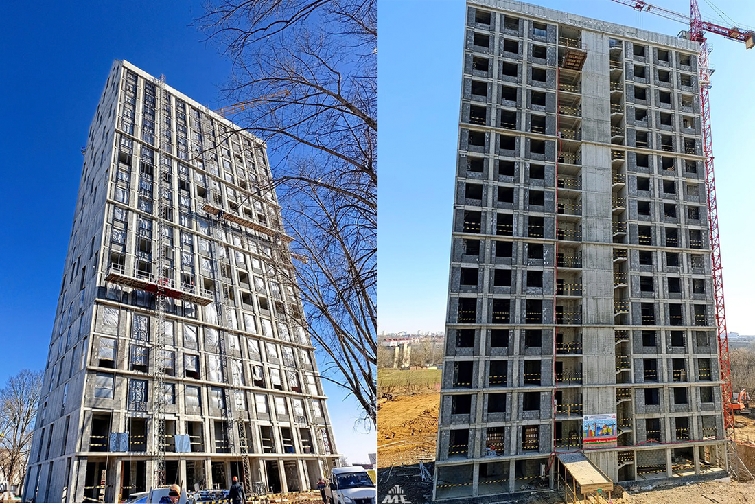 Сейчас можно увидеть две высотки. На доме № 1 сейчас монтируются каркасы витражных систем и начинается остекление фасада. Параллельно ведётся устройство кровли.