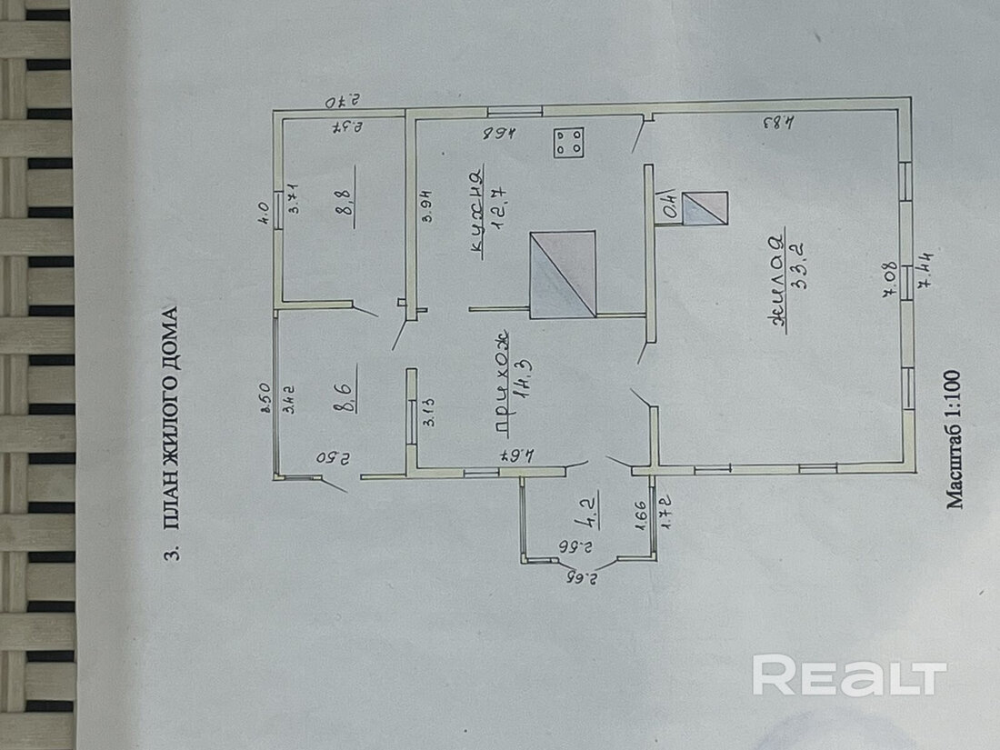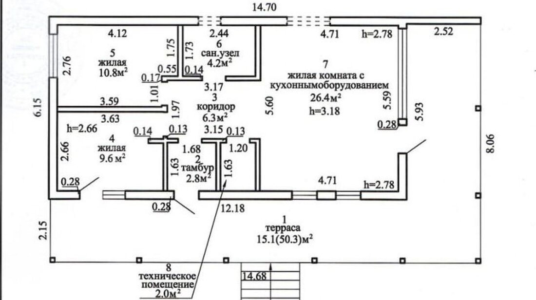 Общая площадь — 82 квадрата. Планировка такая: тамбур, прихожая, большая жилая комната с печью-камином, кухня, веранда, санузел.