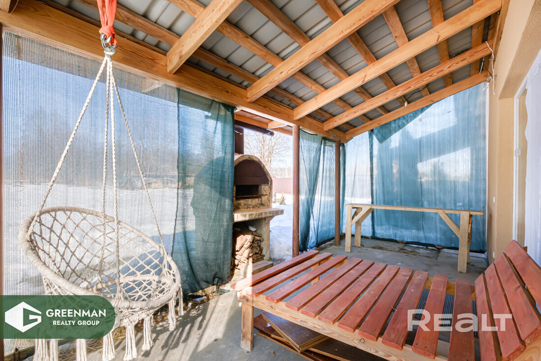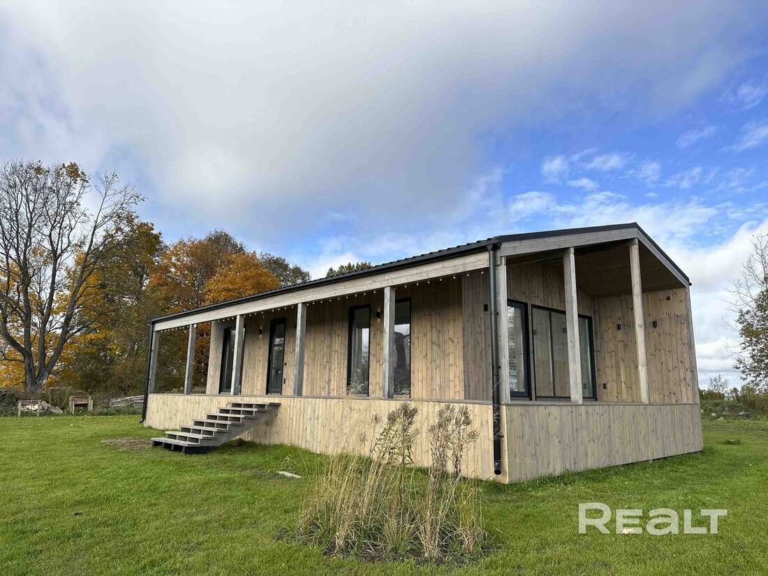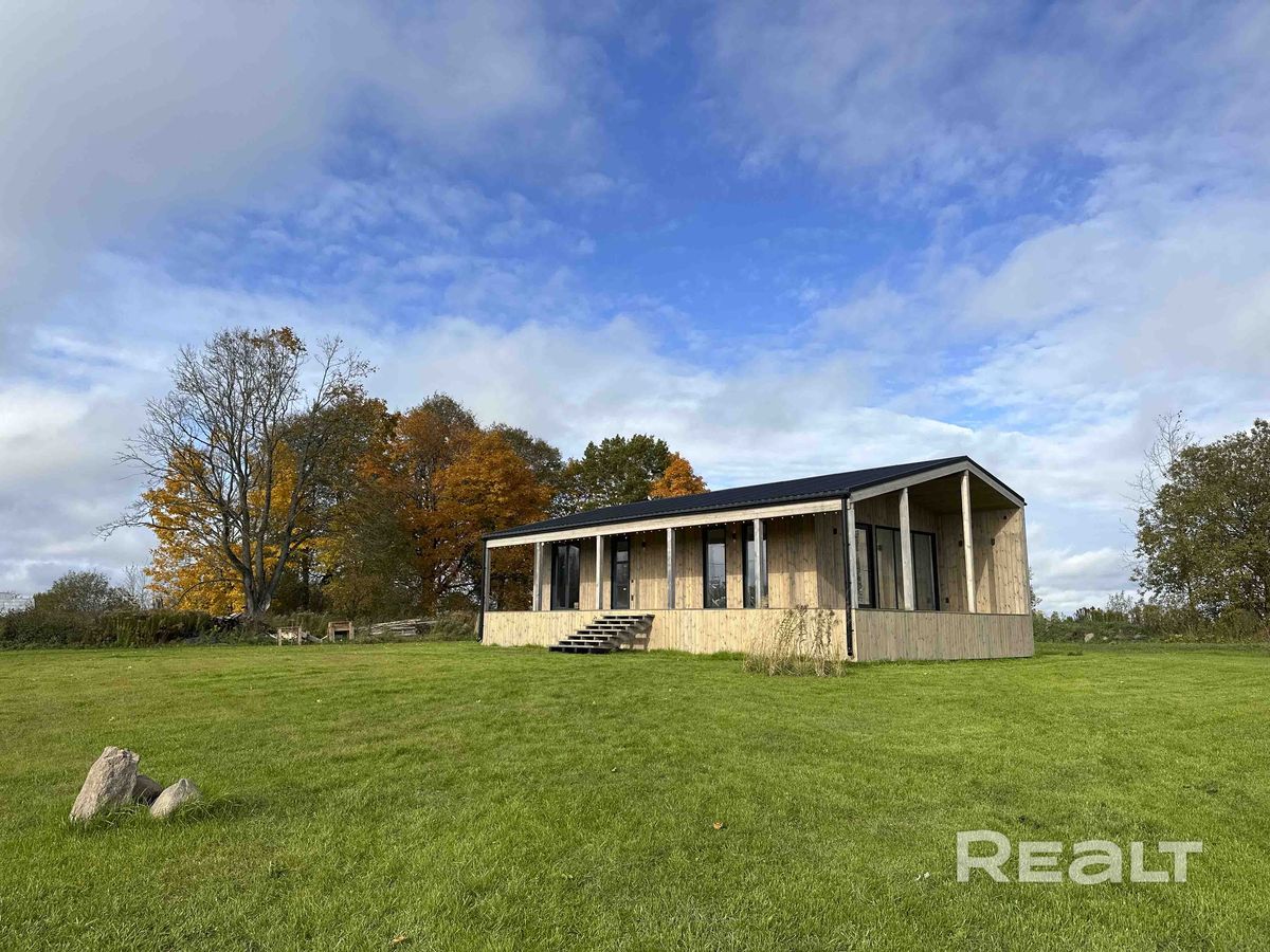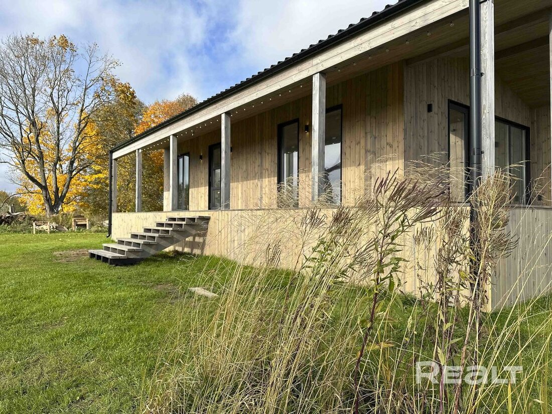 Это новый барнхаус для круглогодичного проживания или сдачи в аренду. К нему примыкает широкая Г-образная терраса. Дом каркасный, 2026 года постройки, введен в эксплуатацию. Фундамент под ним свайный, на крыше металлочерепица, деревянный каркас техсушки с двойным контуром утепления, панорамные окна Rehau с двойным стеклопакетом и энергосберегающим покрытием.