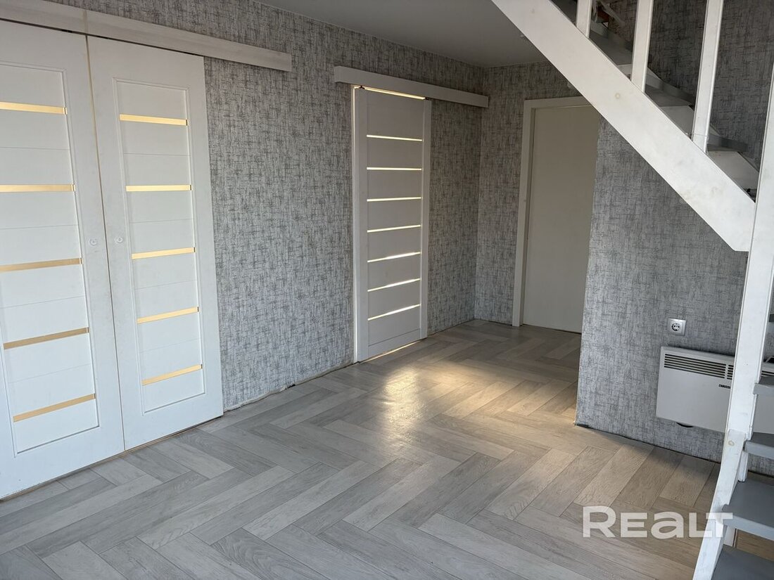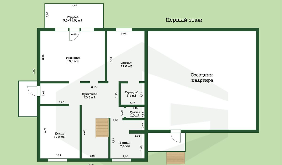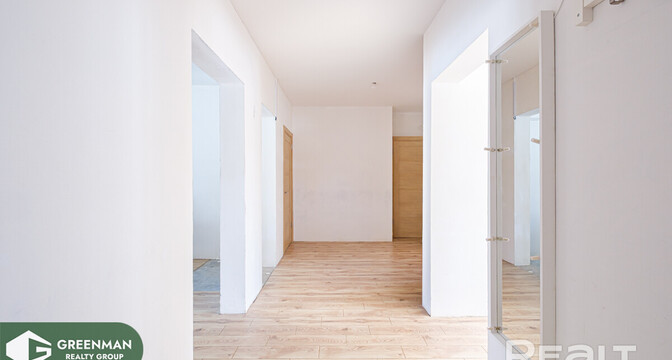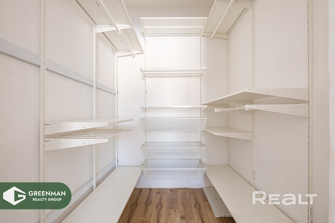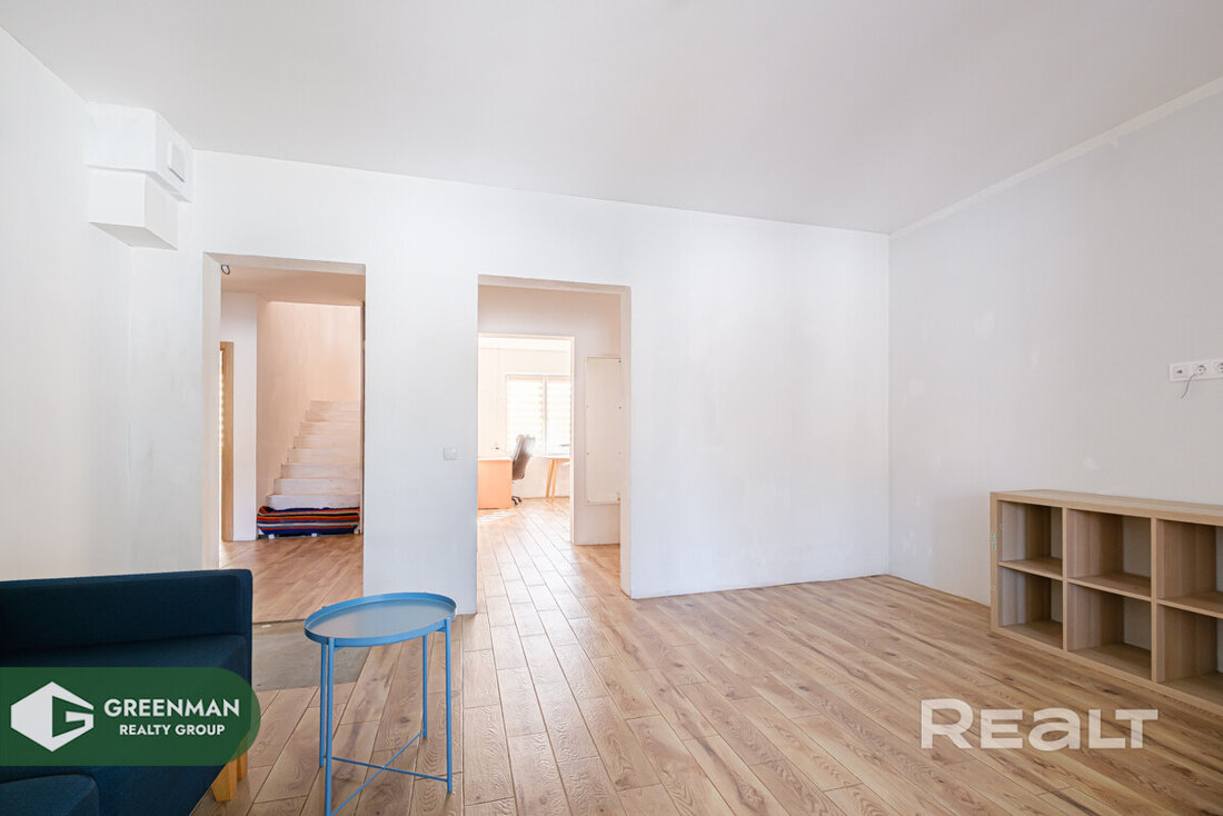 Квартира двухэтажная, общая площадь — 156,7 м2. На первом этаже расположены прихожая, кухня, гостиная, спальня с гардеробной, раздельный санузел, топочная. Полностью готов к проживанию, есть вся необходимая мебель. На кухне индукционная плита, духовка, холодильник, стиральная машина, телевизор.