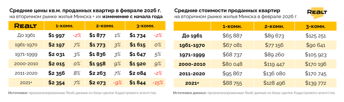 По итогам февраля в Минске нашли новых владельцев 1 156 квартир. С одной стороны, налицо большой прирост по сравнению с 800 сделками января. Но с другой, минус 300 квартир по сравнению с февралем прошлого года. Хотя 2025 год и так был далеко не рекордный по продажам.