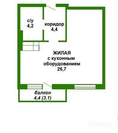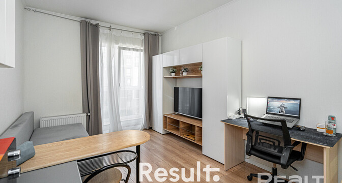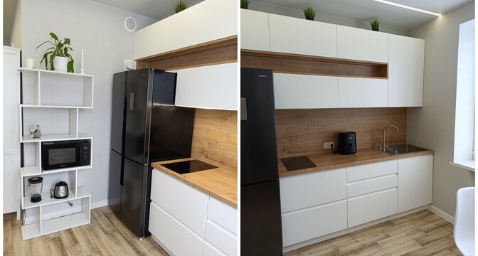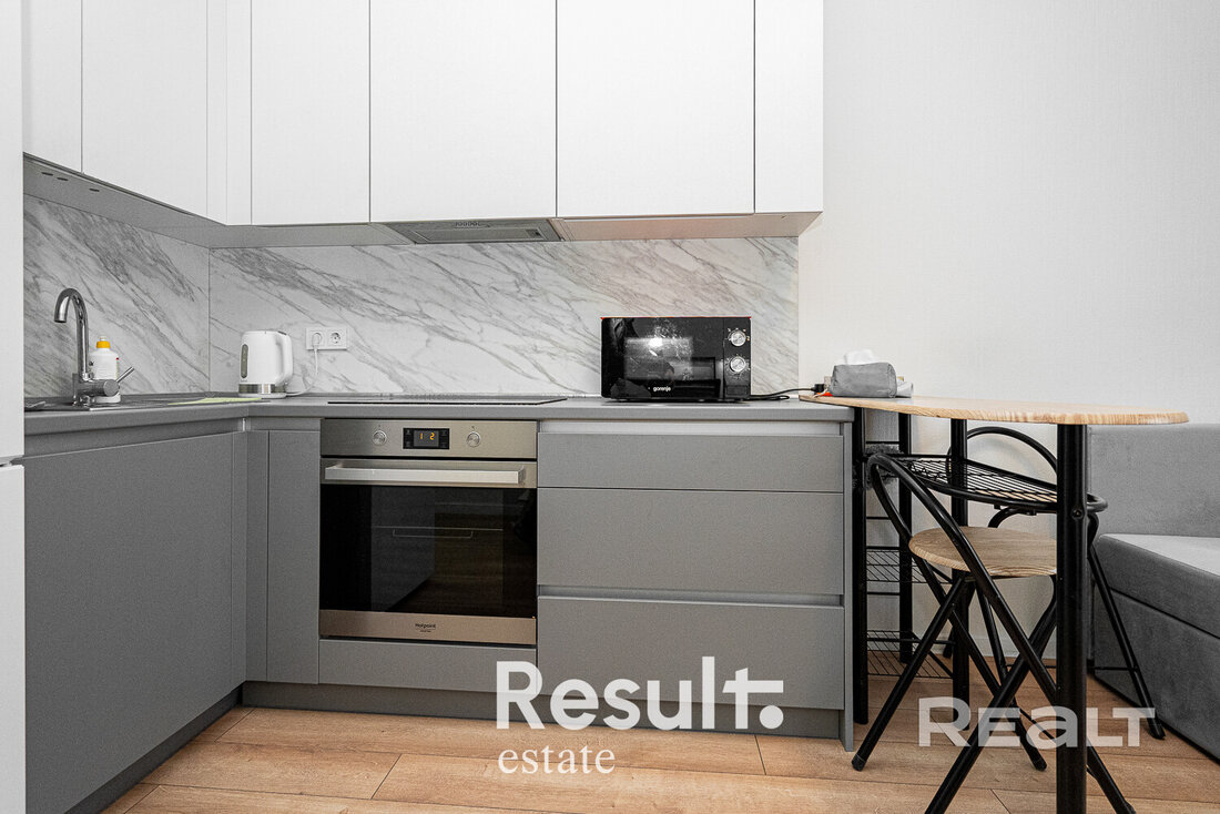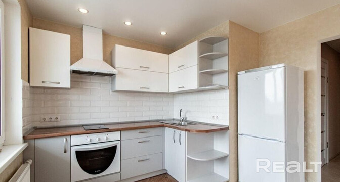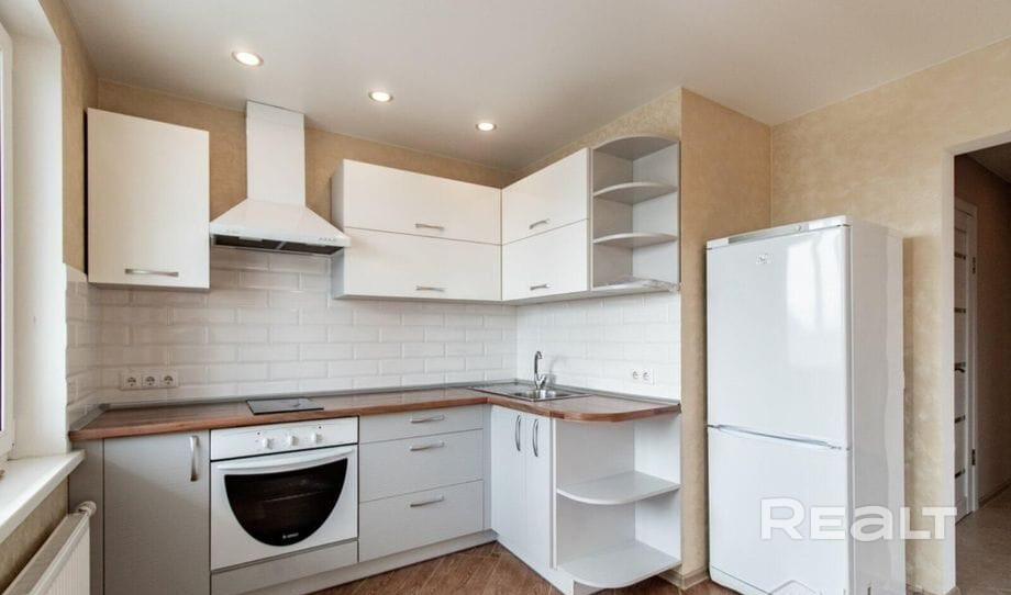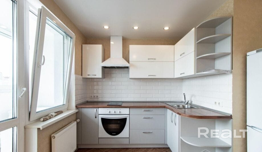 Тут выровнены и окрашены стены и потолки, на полу уложен ламинат, в санузле – плитка. Кухня идет со встроенной техникой: варочной панелью, духовым шкафом, холодильником, вытяжкой. В студии есть застекленная лоджия.