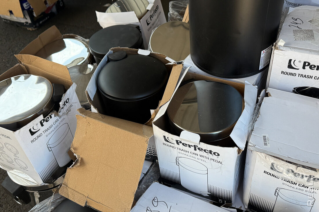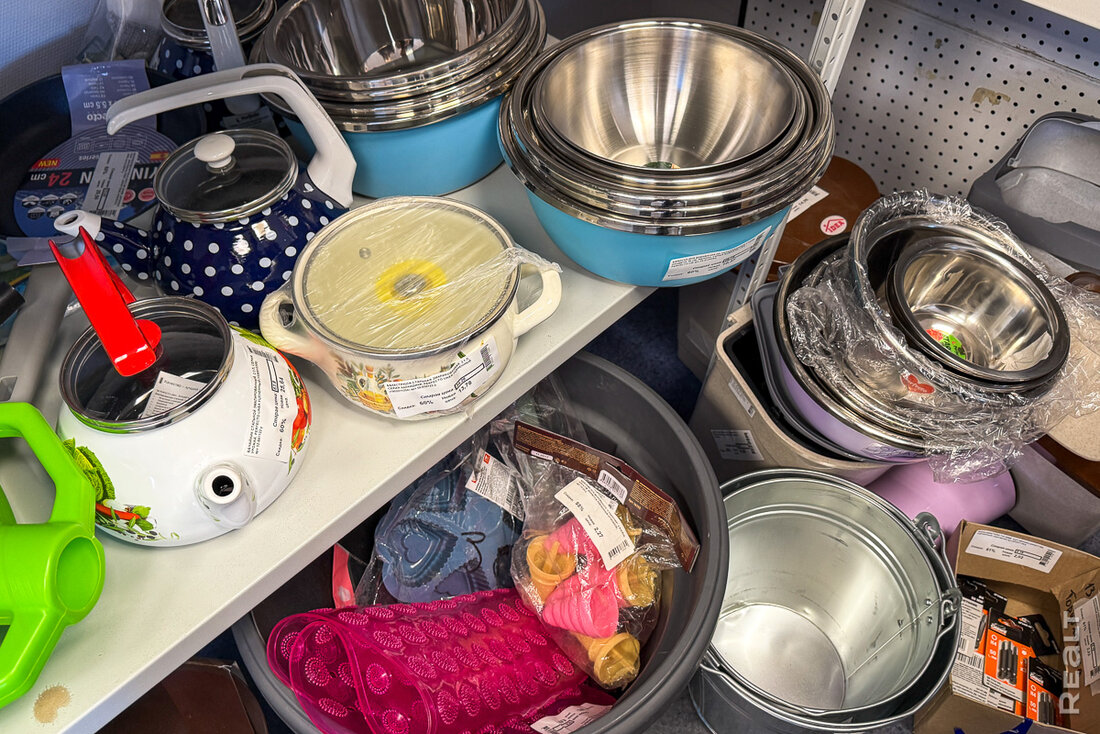 В этом же помещении можно найти и более массовые вещи. Так, например, за 3−5 рублей продаются мусорные ведра разных размеров. Они, судя по всему, пострадали при транспортировке: на них есть вмятины.