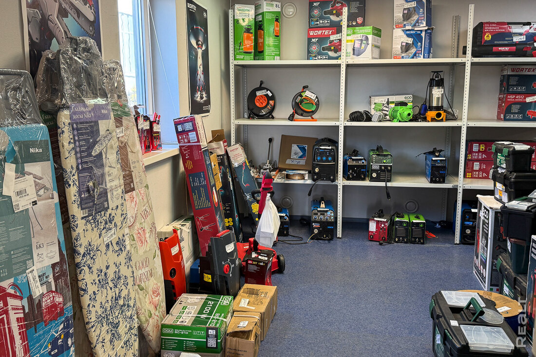 Рядом с «У нескладовым» находится склад интернет-магазина 7745.by. Это соседство неслучайно: в нашем магазине продают уцененные товары из этого интернет-магазина. В основном, товары новые, а продаются со скидкой из-за поврежденной упаковки. Все они на гарантии — такой же, как и в магазине. Есть один стеллаж с товарами бывшими в употреблении после ремонта — на такие дают гарантию три месяца.