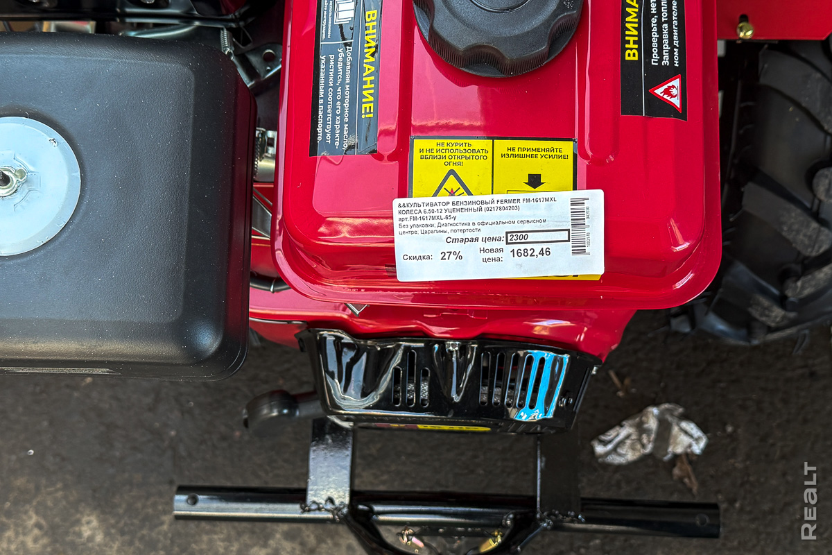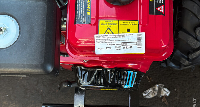 Культиватор бензиновый с обычной стоимостью 1 746 рублей выставлен за 1 326 рублей. На нем тоже есть потертости, а еще его относили на диагностику в сервисный центр. Ровно с такими же дефектами продается и другая модель культиватора — 1 682 рубля вместо 2 300.