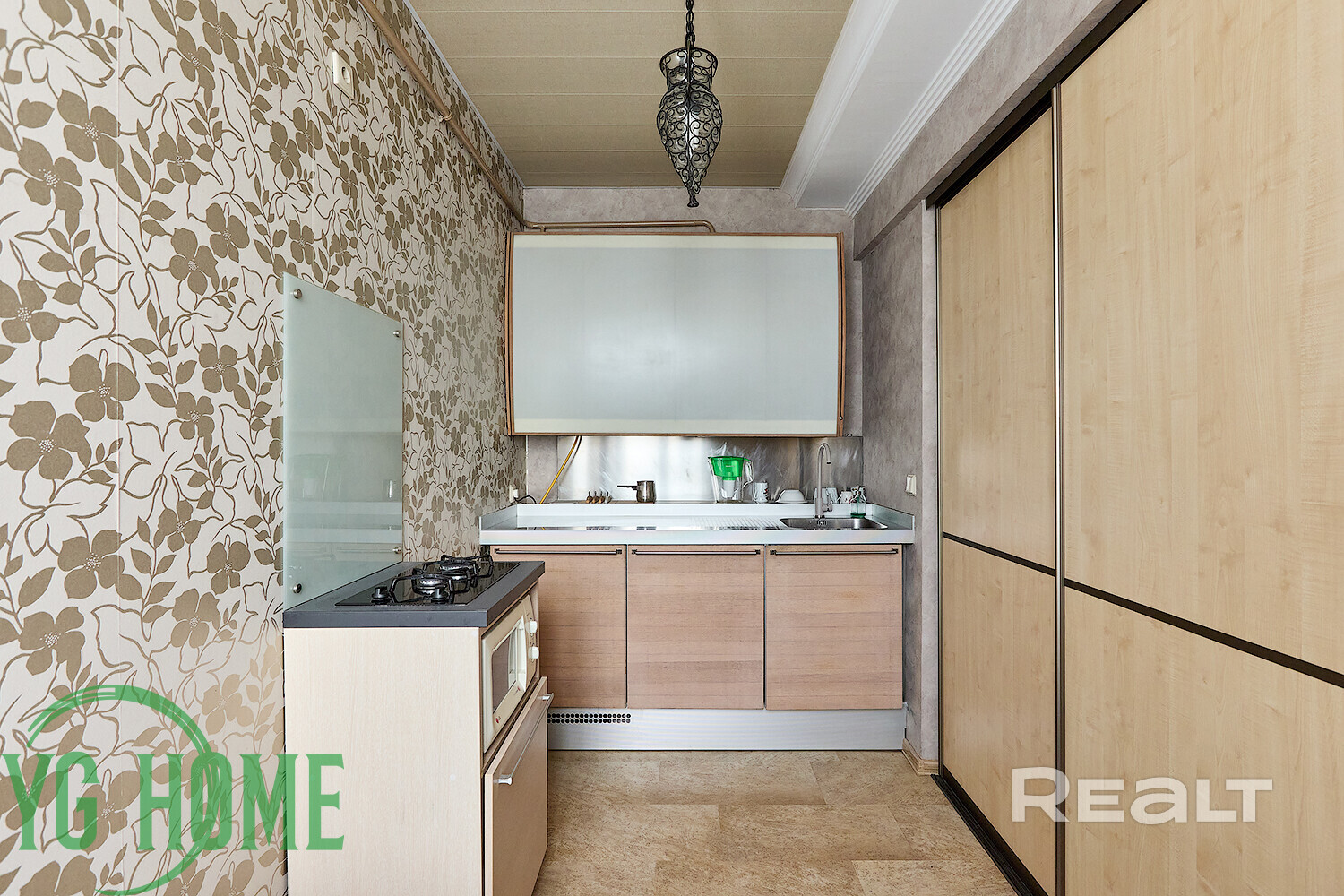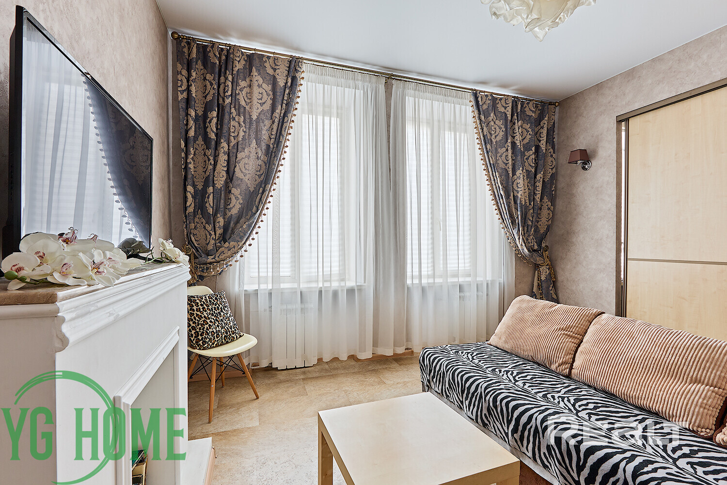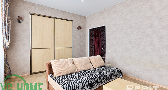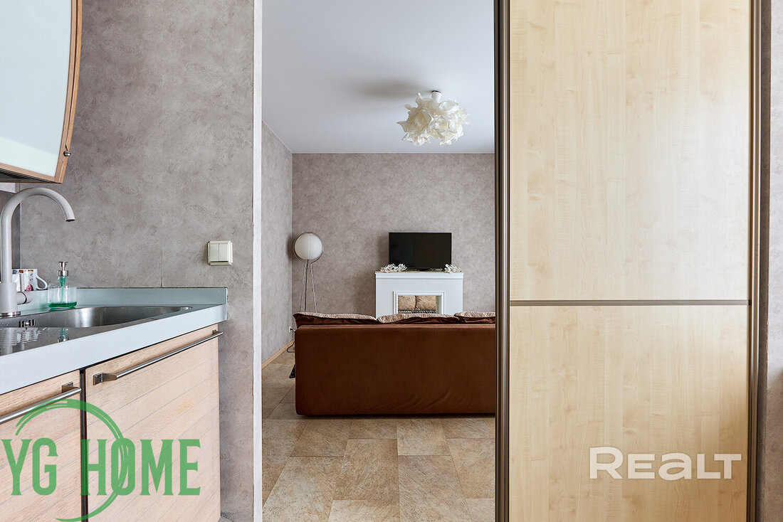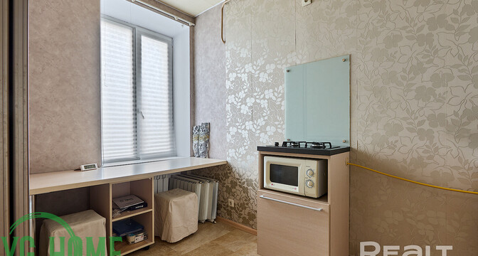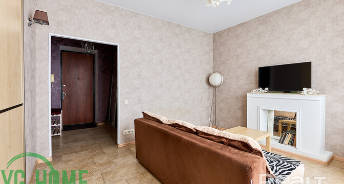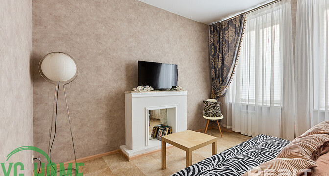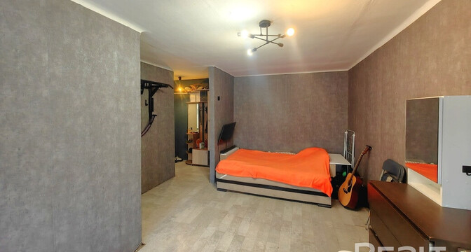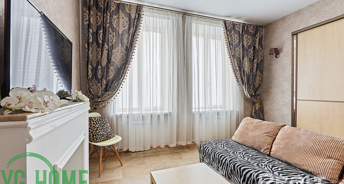 Жилье выставляется в хорошем состоянии. Высота потолков достигает 2,9 метра. Тут обустроена встроенная кухня с фурнитурой Blum и мойкой из искусственного камня. Стены выровнены и оклеены обоями. Потолки – натяжные, матовые. В комнате стоит раскладной диван, шкаф-купе. На полу была сделана стяжка, затем постелили линолеум.