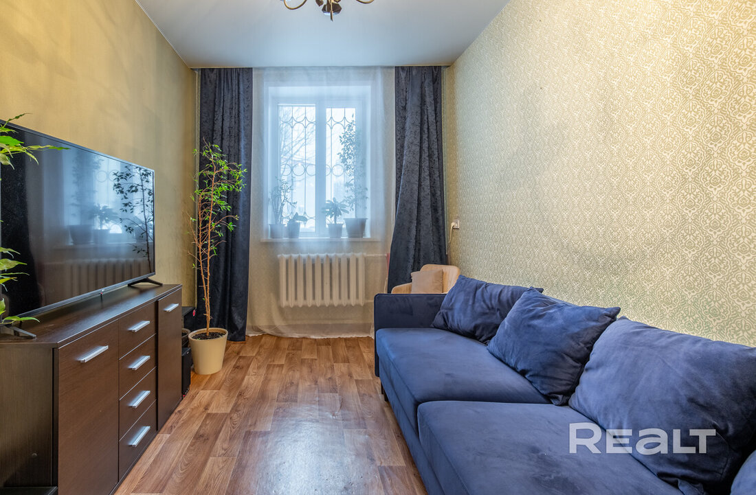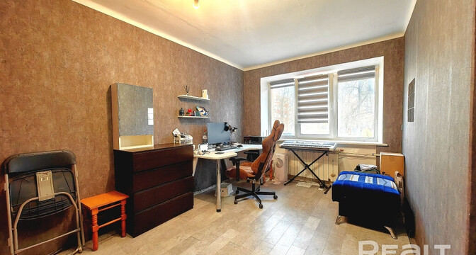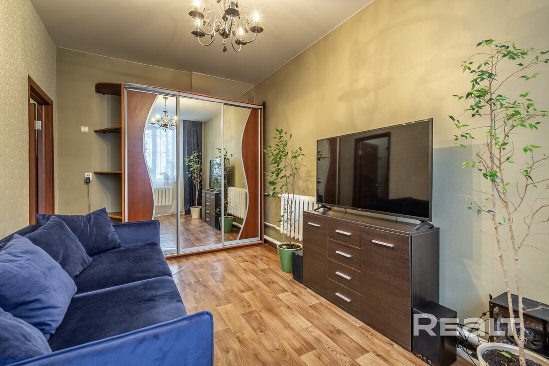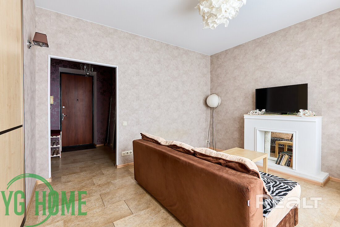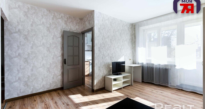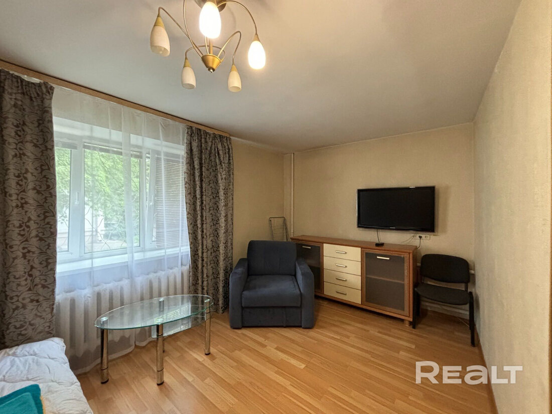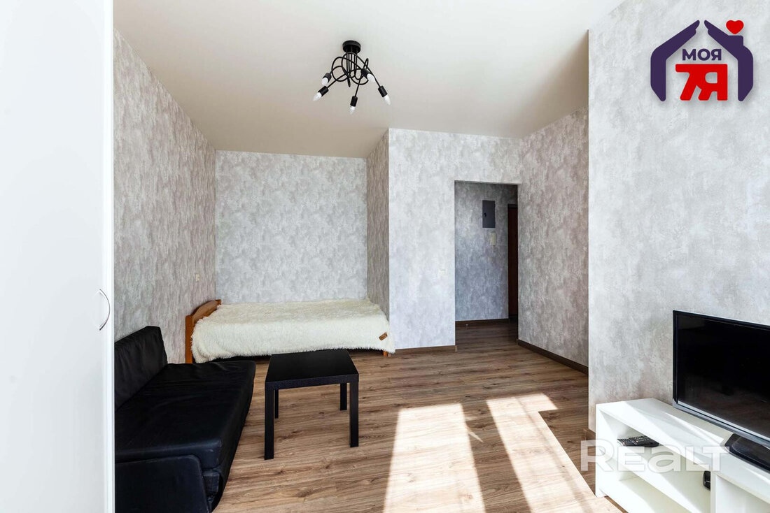 Жилье готово к проживанию, выглядит аккуратным. В окнах стоят стеклопакеты, сделаны натяжные потолки, на полу лежат плитка и ламинат, стены оклеены обоями. Из комнаты есть выход на застекленный балкон. После продажи остаются холодильник, стиральная машина, телевизор и мебель.