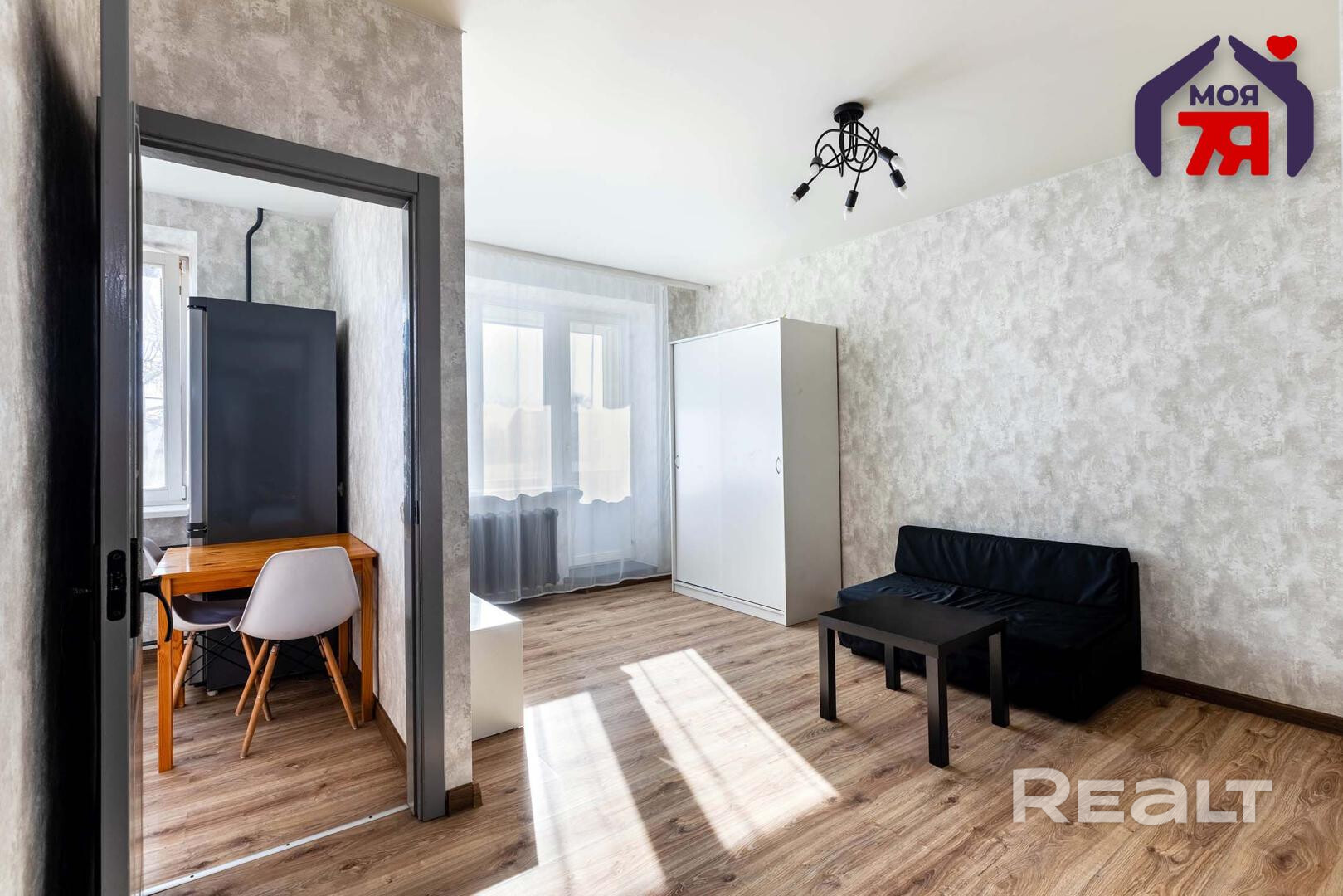 Квартира готова к проживанию. Тут сделан косметический ремонт. Покупателю останется встроенная кухня, шкаф-купе, кровать, гарнитур в комнате, а также техника (холодильник и стиральная машина). На полу лежит ламинат. Окна в квартире выходят во двор, установлены стеклопакеты.