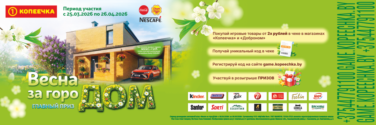 +375 (44) 779−11−00. Период проведения рекламной игры «Весна за гороДОМ» с 25.03.2026 по 29.06.2026 г. Организатор ООО «ЭфСиБи Бел». УНП 193 185 741. Свидетельство № 4633 о государственной регистрации рекламной игры от 02.03.2026.