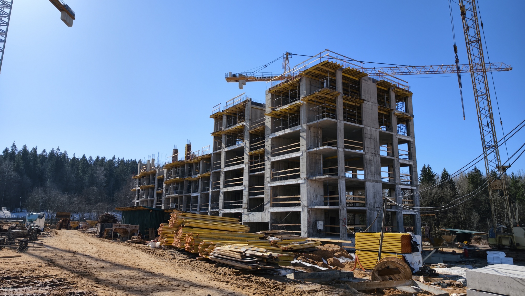 Сегодня застройщик впервые предложил всем желающим квартиры в доме № 5. Эта новостройка рассчитана на 2 подъезда, 5−6 этажей и 74 квартиры площадью от 34 до 82 квадратов. Дом будет стоять чуть в стороне от основного жилого массива — рядом с участком леса и прямо напротив паркинга. Сейчас здание уже строится. Сдача новостройки запланирована на 2027 год.