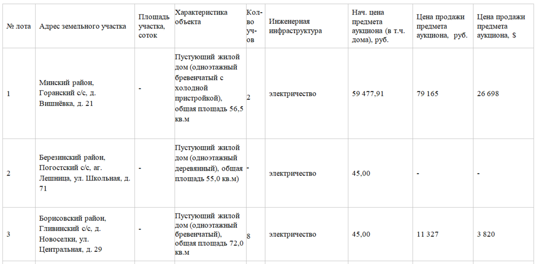 Итак, участникам аукциона было предложено 16 лотов — пустующих жилых домов в Минском (1), Березинском (1), Борисовском (6) и Слуцком (8) районах Минской области.