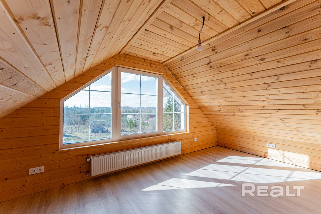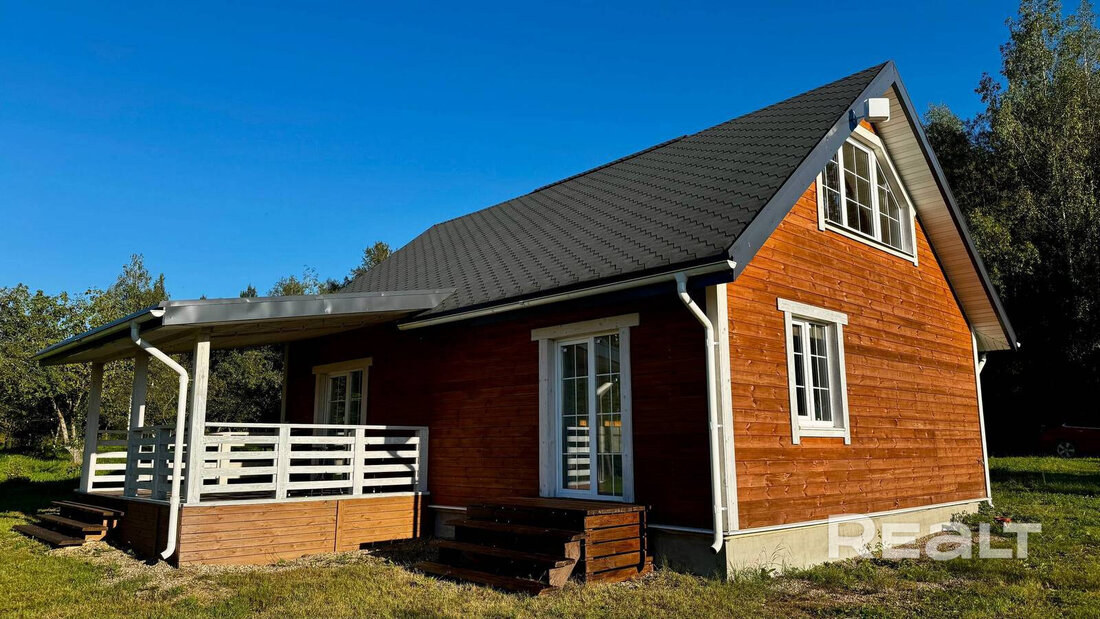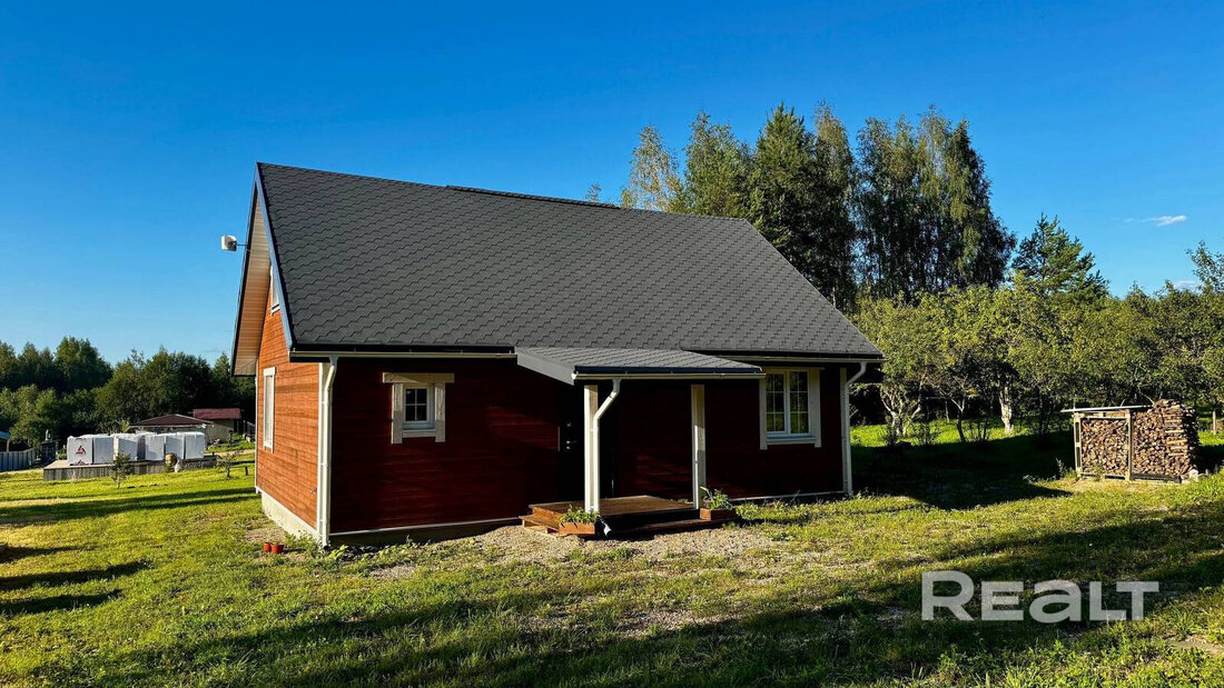 Дом в СТ «Надежда» в Логойском районе был построен в 2022 году. Он каркасный и двухэтажный, стоит на монолитном фундаменте. В качестве кровли на крыше лежит металлочерепица. Площадь дома — 66 квадратных метров.