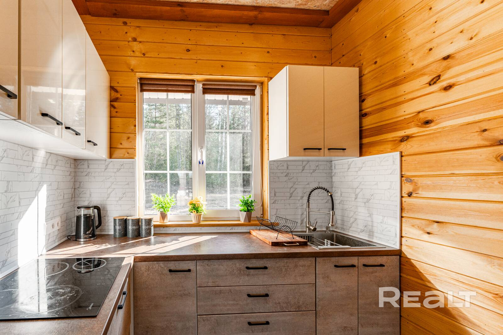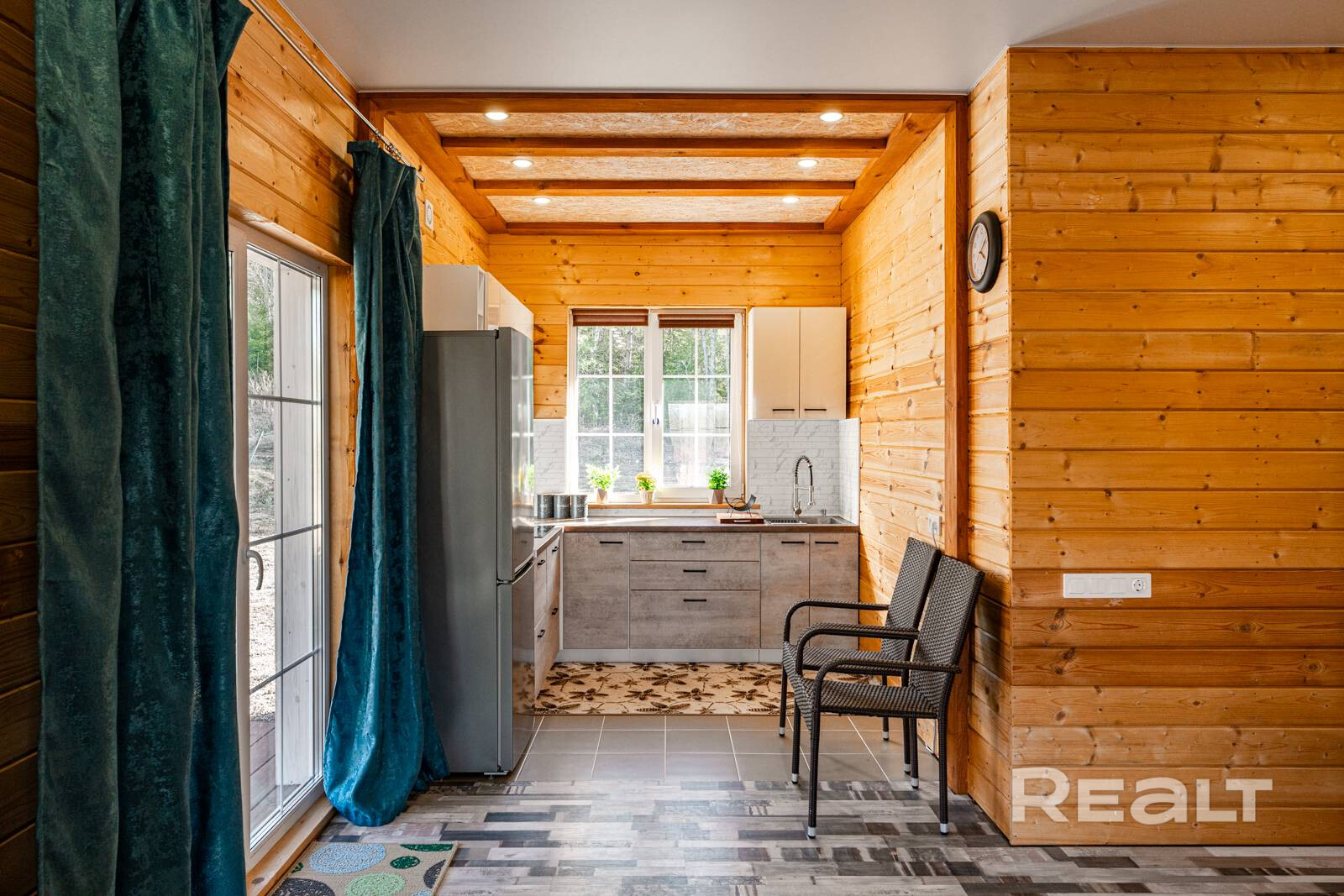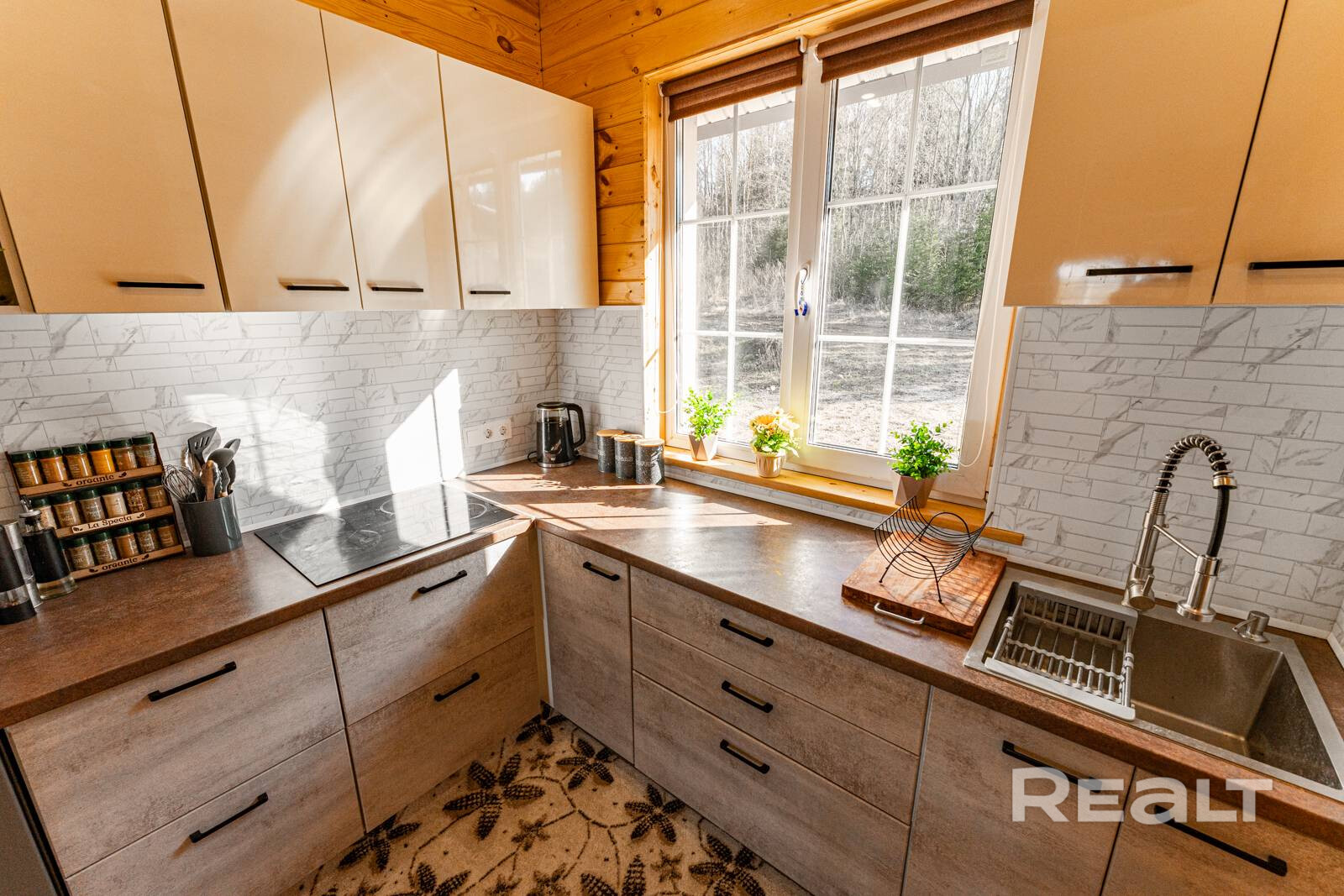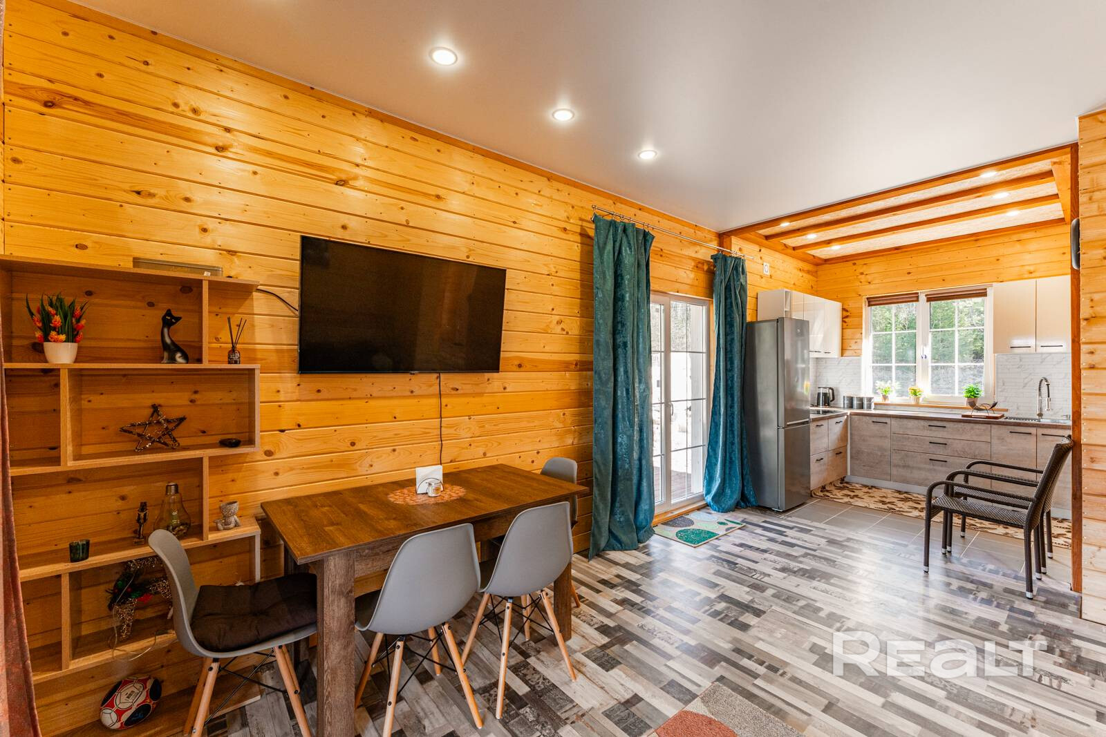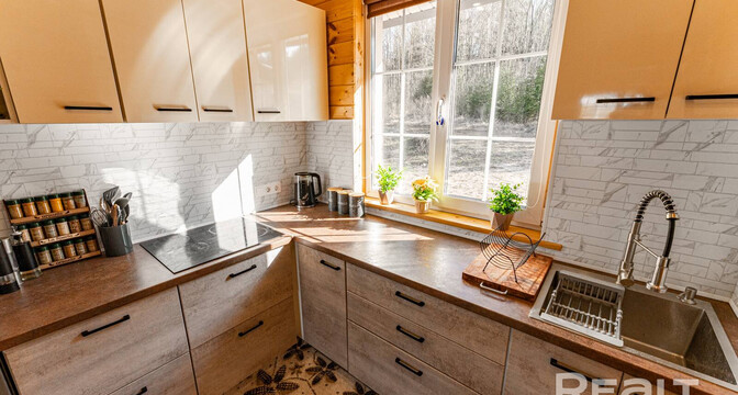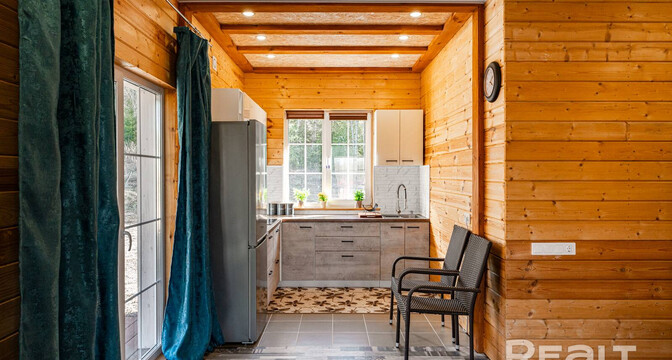 Он полностью готов для круглогодичного проживания. На первом уровне обустроена кухня-гостиная с выходом на террасу. Здесь есть кухонный гарнитур с необходимой бытовой техникой.