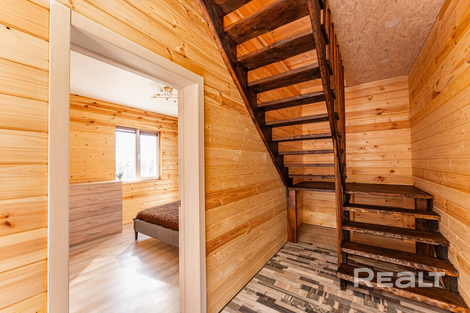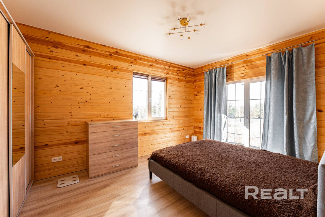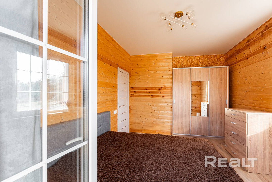 Рядом разместилась изолированная комната, где поместились полноценная кровать и шкаф. Она достаточно светлая благодаря двум окнам. Отсюда также можно выйти на участок.