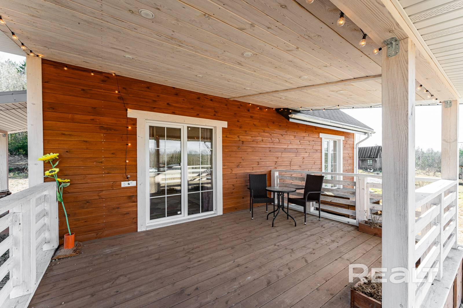 В доме продумано четыре выхода на участок. Один из них ведет через крытую террасу, куда владельцы поставили садовую мебель для отдыха.